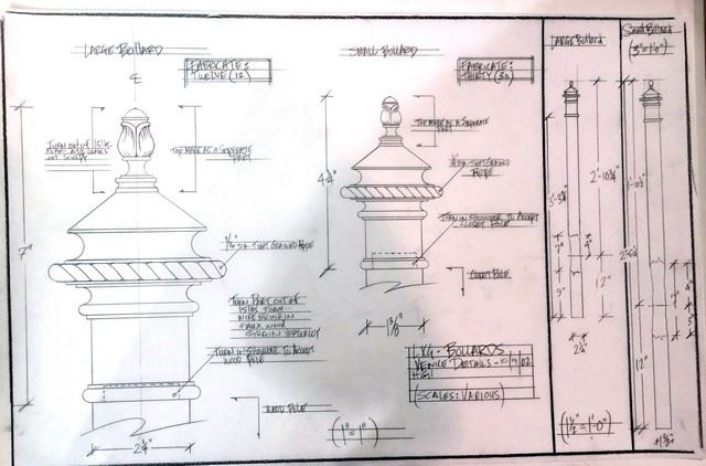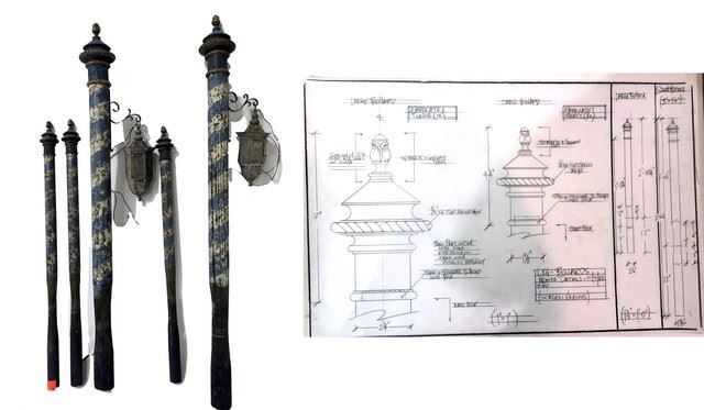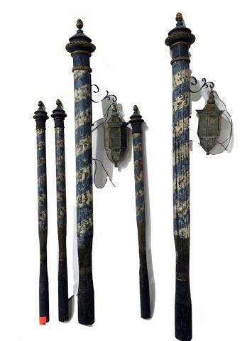 This collection of large and small bollards and lamps were dressed in the canals in the city of Venice miniature and used to tied up the Gondolas. A combination of a hand weathered wood piling caped with a cast resin finial. Each piece is meticulously hand painted blue with a white stripe. Lamp is wired with socket and includes bulb. Fabricated from wood, resin and brass. 42" long x 4" wide. Also includes original pencil on vellum construction drawing used to build the 1:5 Scale Bollards for the Venice Miniature. This is from the celebrated collection of Academy Award winning New Deal Studios. New Deal Studios is a 21st Century Media Studio, unlike any in the world. A full-service film production and visual effects studio, with over 20 years of iconic imagery, New Deal Studios develops, designs, prototypes, and creates all types of high caliber media projects. Founded in 1995 by Matthew Gratzner, Ian Hunter and Shannon Blake Gans, this artist owned and operated independent studio, born in the heyday of visual effects, has truly evolved into the technology driven studio for the future, consistently delivering the perfect marriage of artistry and technology. Award winning credits by New Deal Studios include high-profile projects such as Dark Knight Rises, Hugo, The Avengers, Oz the Great and Powerful, Iron Man, The Dark Knight, Watchmen, I am Legend, Night at the Museum, Whiteout, 2012, Alice in Wonderland, Inception, Battleship and Interstellar.