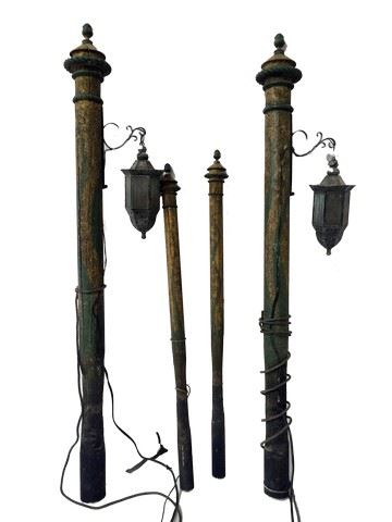 This collection of large and small bollards and lamps were dressed in the canals in the city of Venice miniature and used to tied up the Gondolas. A combination of a hand weathered wood piling caped with a cast resin finial. Each piece is meticulously hand painted yellow with a green wavering flame. Fabricated from wood, resin and brass. 42" long x 4" wide. 1:5 scale. This is from the celebrated collection of Academy Award winning New Deal Studios. New Deal Studios is a 21st Century Media Studio, unlike any in the world. A full-service film production and visual effects studio, with over 20 years of iconic imagery, New Deal Studios develops, designs, prototypes, and creates all types of high caliber media projects. Founded in 1995 by Matthew Gratzner, Ian Hunter and Shannon Blake Gans, this artist owned and operated independent studio, born in the heyday of visual effects, has truly evolved into the technology driven studio for the future, consistently delivering the perfect marriage of artistry and technology. Award winning credits by New Deal Studios include high-profile projects such as Dark Knight Rises, Hugo, The Avengers, Oz the Great and Powerful, Iron Man, The Dark Knight, Watchmen, I am Legend, Night at the Museum, Whiteout, 2012, Alice in Wonderland, Inception, Battleship and Interstellar.