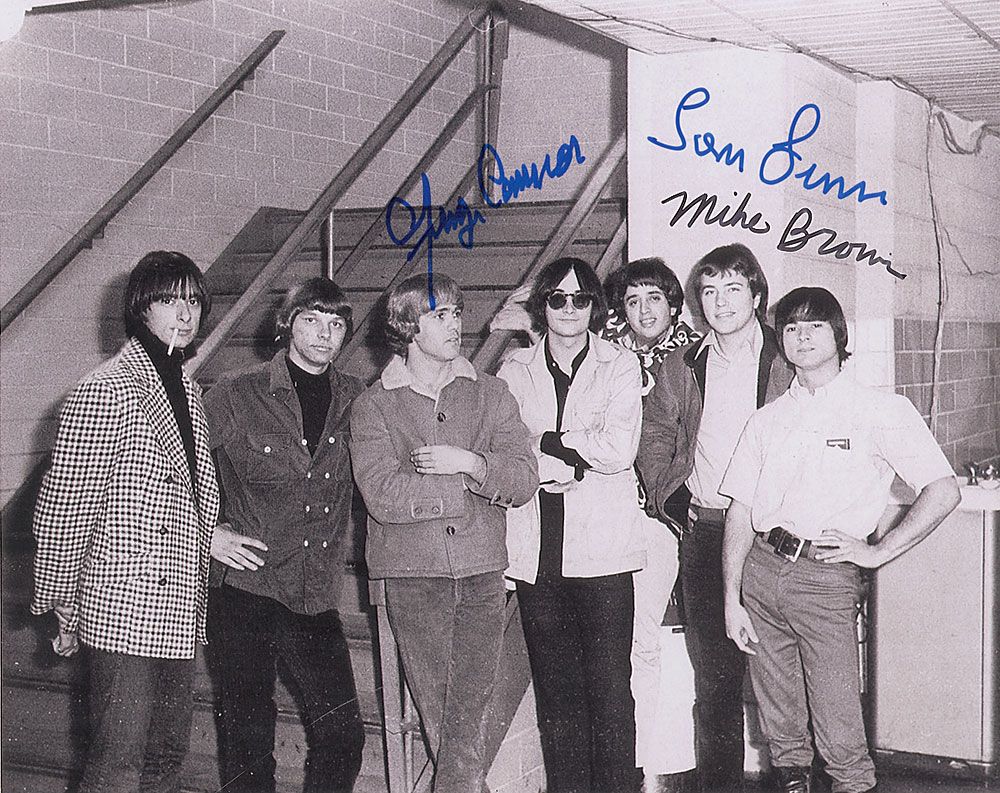 Glossy 10 x 8 group photo, signed in blue and black felt tip by original members Mike Brown, George Cameron, and Tom Finn. In fine condition.