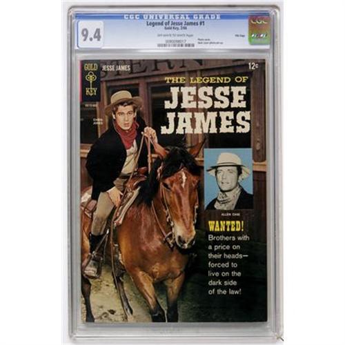 <B>The Legend of Jesse James #1 File Copy (Gold Key, 1966) CGC NM 9.4 Off-white to white pages.</B></I> Photo cover. Back cover photo pin-up. Overstreet 2007 NM- 9.2 value = $35. CGC census 10/07: 8 in 9.4, 6 higher.<BR><BR><b>Shipping:</b> Comics - Slabbed (certified) (<a target="_blank" href="http://www.heritageauctions.com/common/shipping.php">view shipping information</a>)