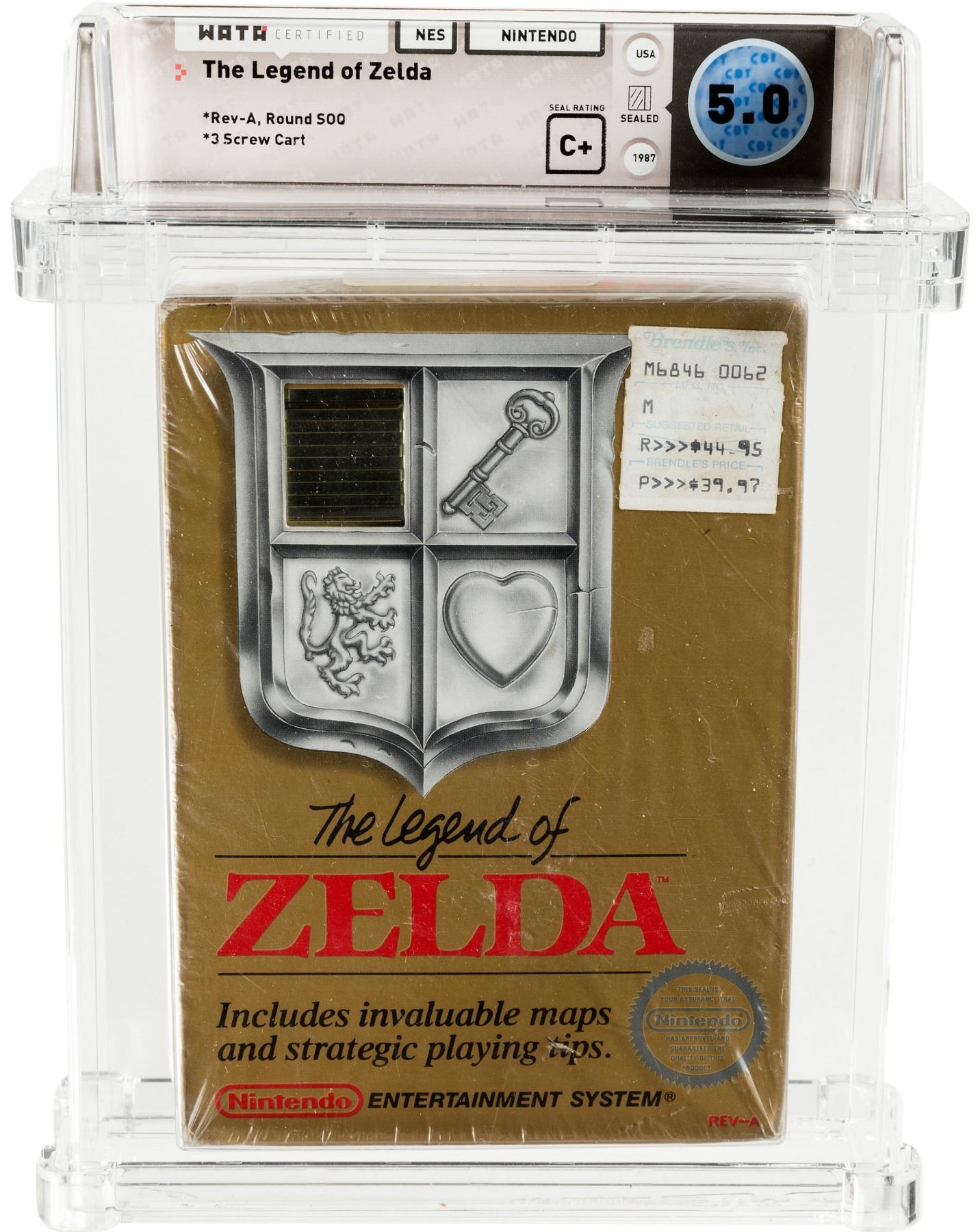 A gold cartridge example. First game in the series and appearance of Link, Zelda, and Ganon. Produced by Shigeru Miyamoto with music by Koji Kondo.