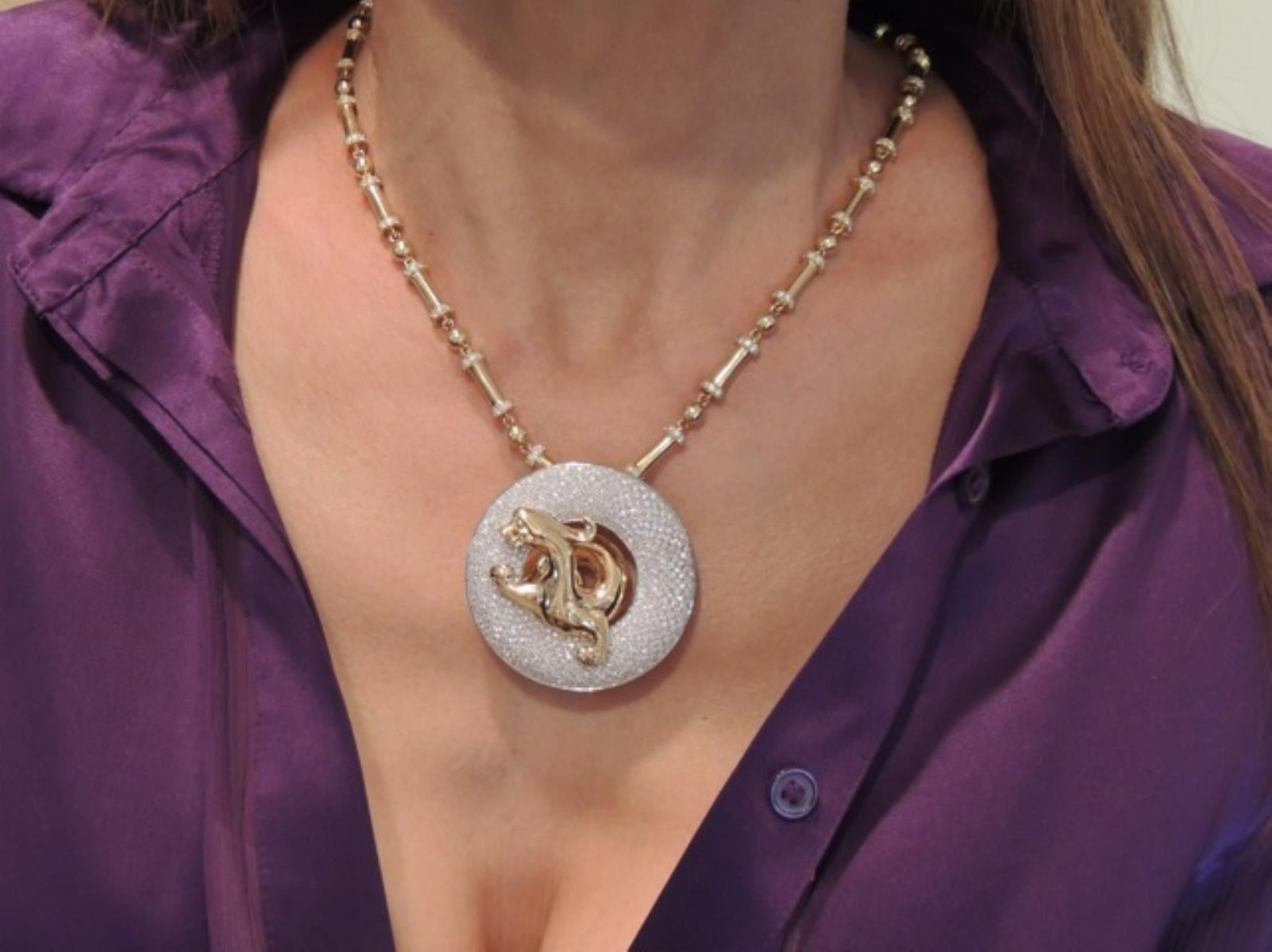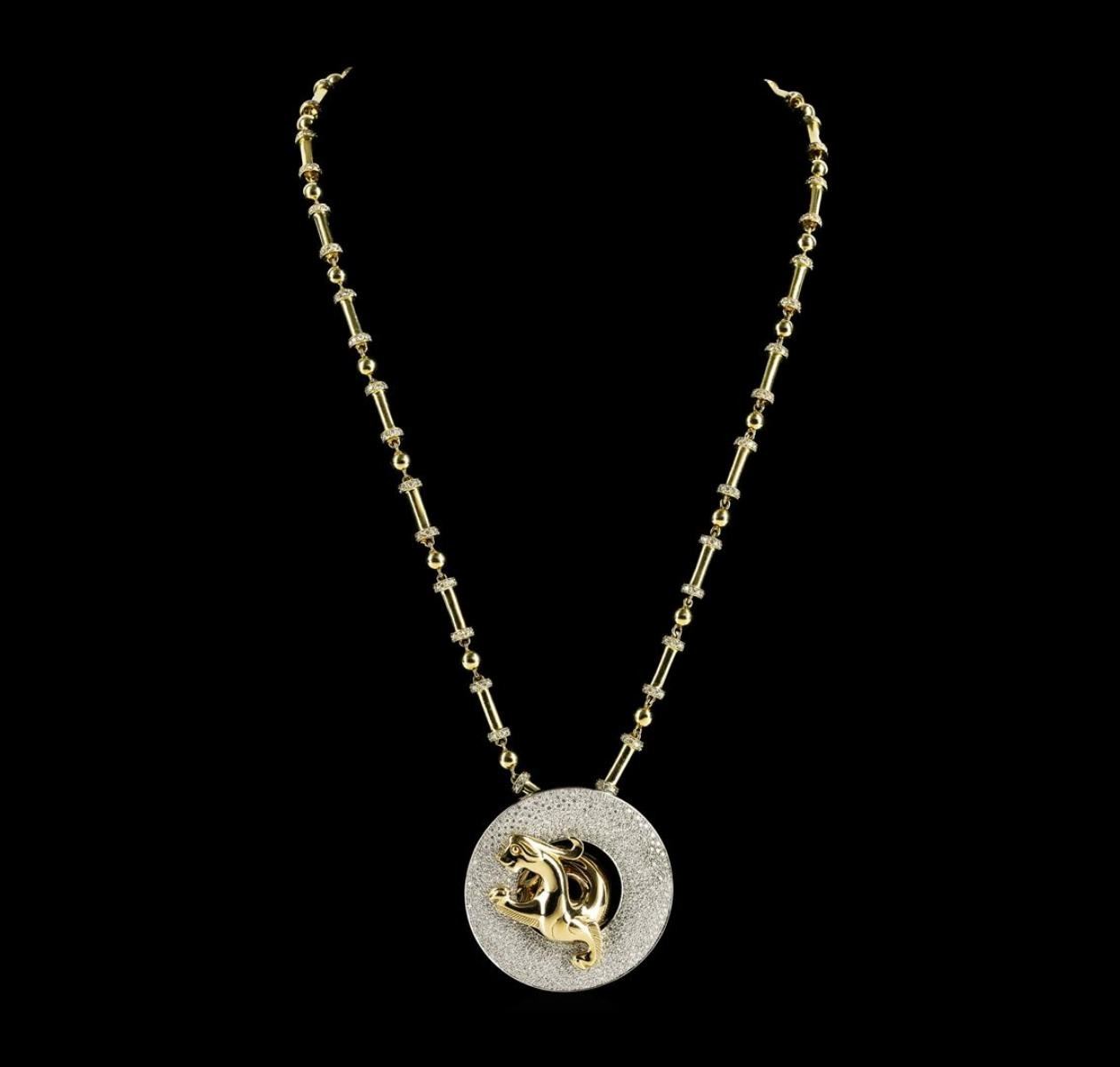 The Legend of the Dragon, is part of a limited edition collection, copyrighted design, by award winning designer Steven Zale. This pendant is inspired by an actual artifact dating back to 475 B.C. The pendant is made of solid 18-karat white and yellow gold. There are a total of 524 round brilliant diamonds micro-pave' set into the pendant, creating a total weight of 4.00ctw. Each diamond is G in color and VS in clarity. The chain that comes with the pendant is solid 18-karat yellow gold. Each link has micro-pave' diamonds set into each custom made link. There is a total of 481 round brilliant diamonds in the neck chain, creating a total weight of 5.25ctw. Each round brilliant diamond is G in color and VS in clarity. There is a combined total weight of 8.50ctw set into this exquisite limited edition art piece. This piece is signed: 8 of 88. With multiple legends entrenching the dragon lore throughout Chinese history and culture, The Dragon is a symbol of the greatest power imaginable. Though indisputably frightening, the dragon represents the source of all energy, or the way, for the Chinese people. It is held throughout legend that the dragon bestows good fortune upon those who believe in its powers. Inspired by an actual artifact that dates back to the Warring States Era (475 B.C.), the iconic Chinese dragon is brought to sparkling life through the innovation of Steven Zale of Zalemark. The original artifact, which lay buried and forgotten through the centuries, is a one-of-a-kind symbol of the dragon's continuing power, possessing inestimable cultural value. Cast in 18-karat gold and diamonds, and measuring two inches in diameter, the piece comes with a matching solid-gold and diamond necklace as described above. The original artifact was discovered by a renowned archeologist in 1986. Today, award-winning designer Steven Zale brings the legacy and luck of the Chinese dragon up to date through his stunning design.