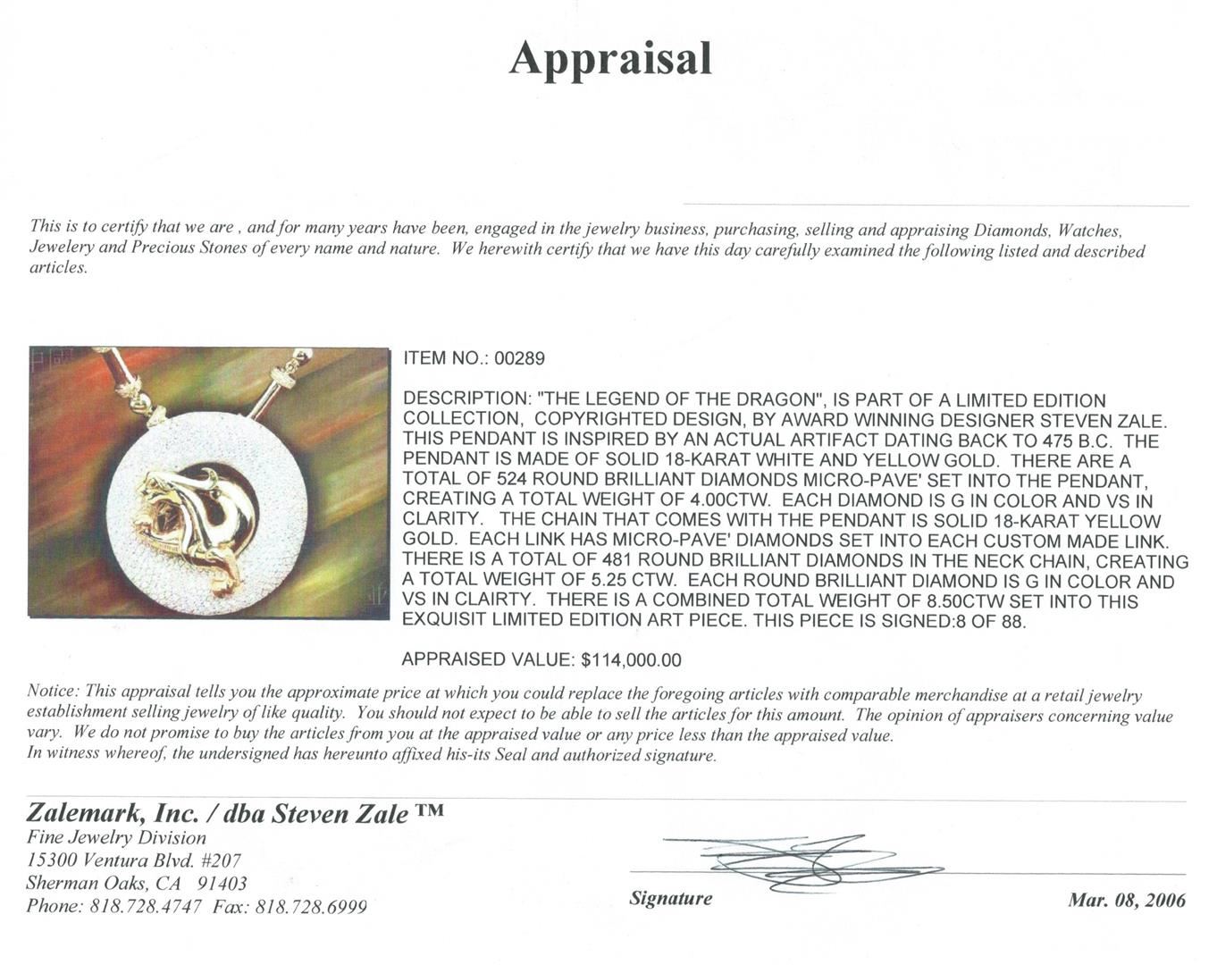 The Legend of the Dragon, is part of a limited edition collection, copyrighted design, by award winning designer Steven Zale. This pendant is inspired by an actual artifact dating back to 475 B.C. The pendant is made of solid 18-karat white and yellow gold. There are a total of 524 round brilliant diamonds micro-pave' set into the pendant, creating a total weight of 4.00 ctw. Each diamond is G in color and VS in clarity. The chain that comes with the pendant is solid 18-karat yellow gold. Each link has micro-pave' diamonds set into each custom made link. There is a total of 481 round brilliant diamonds in the neck chain, creating a total weight of 5.25ctw. Each round brilliant diamond is G in color and VS in clarity. There is a combined total weight of 8.50 ctw set into this exquisite limited edition art piece. This piece is signed: 8 of 88. With multiple legends entrenching the dragon lore throughout Chinese history and culture, The Dragon is a symbol of the greatest power imaginable. Though indisputably frightening, the dragon represents the source of all energy, or the way, for the Chinese people. It is held throughout legend that the dragon bestows good fortune upon those who believe in its powers. Inspired by an actual artifact that dates back to the Warring States Era (475 B.C.), the iconic Chinese dragon is brought to sparkling life through the innovation of Steven Zale of Zalemark. The original artifact, which lay buried and forgotten through the centuries, is a one-of-a-kind symbol of the dragon's continuing power, possessing inestimable cultural value. Cast in 18-karat gold and diamonds, and measuring two inches in diameter, the piece comes with a matching solid-gold and diamond necklace as described above. The original artifact was discovered by a renowned archeologist in 1986. Today, award-winning designer Steven Zale brings the legacy and luck of the Chinese dragon up to date through his stunning design.