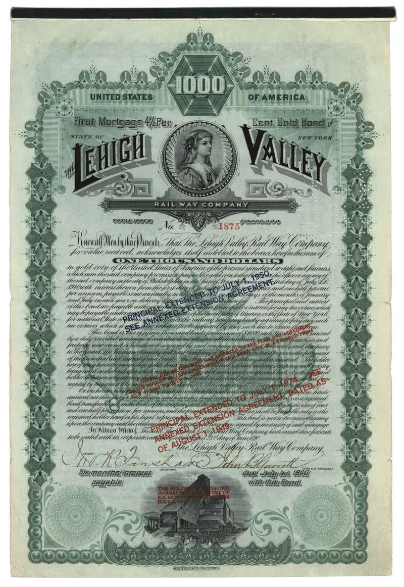 1890, New York. Bond for $1000 bearing 4 1/2%. Vignette at top center of female portrait and train station at bottom center. Perferation cancelled. Very fine.