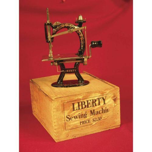 The Liberty Sewing Machine by Ehrich Brothers, NYC in original wood box with instruction booklet and table top clamp. Cast iron, excellent condition. 6 X 7 1/2 X 3 inches.