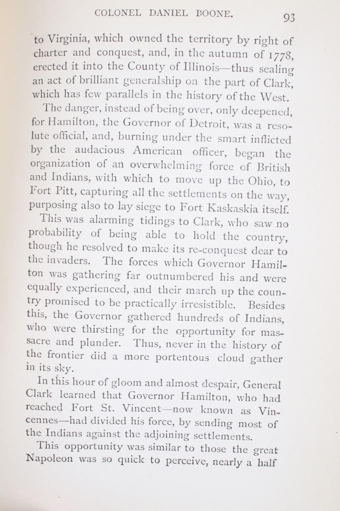Included in this lot we have a hardcover copy of The Life of Boone by Edward Ellis copyrighted 1884. This original copy of The Life and Times of Col. Daniel Boone, Hunter, Soldier, and Pioneer: With Sketches of Simon Kenton, Lewis Wetzel, and Other Leaders in the Settlement of the West was published by Porter & Coates, Philadelphia in 1884. The herioic figurehead of Col. Daniel Boone is characterized by his accomplishments to furthur western expansion in early U.S history shining bright bringing Kentucky to the for-front of the shining constellation that became the Union. Heartfelt by youth for courageous stories facing down wild animals and wilder men, Col. Daniel Boone faced Indian siege the slaughter of men beside him, and the daring rescue of his daughter captured by Indians and rescued by himself and stalwart men around him. The book shows good condition overall with some light wear on the pages. The piece measures 7 3/4" tall by 5 1/4" wide.