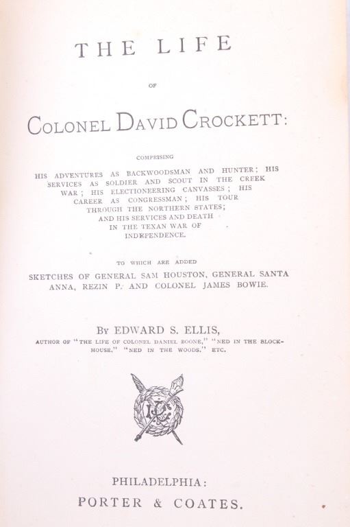 For your bidding pleasure is this The Life of Crockett Alta Edition by Ellis 1884. The "Alta Editions" were published by a group called Coates and Porter" whom were from Philadelphia. The book chronicles the life and adventures of the scout, hunter, woodsman and congressman. The book has a wonderfully decorated cover and shows good condition. The book measures 5.25" x 7.5".