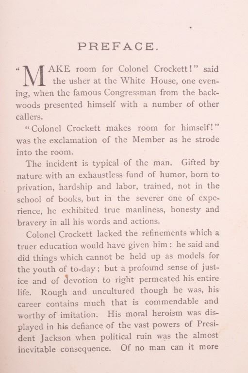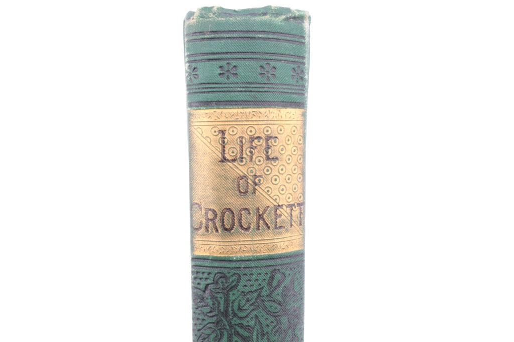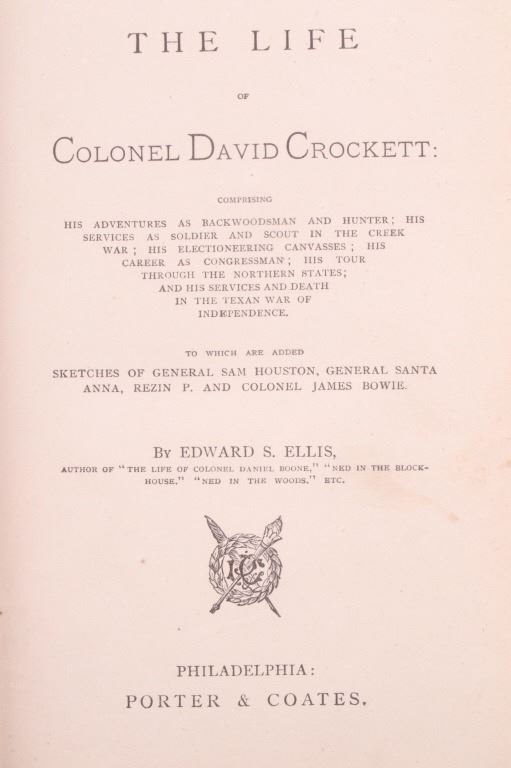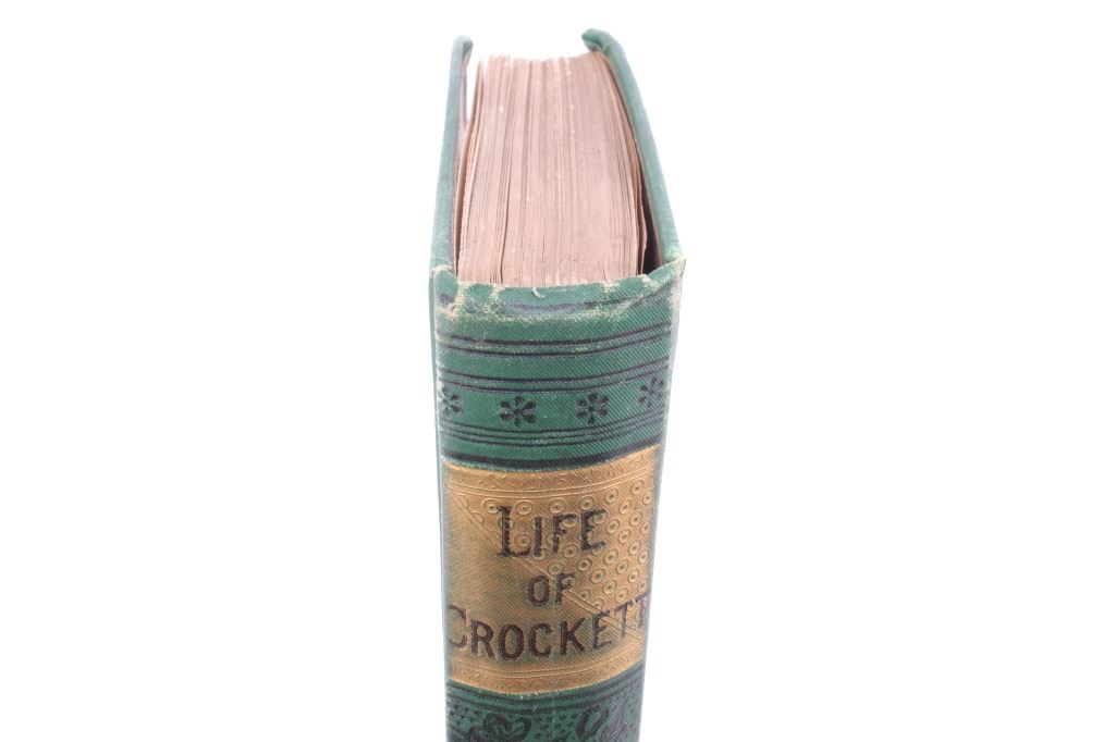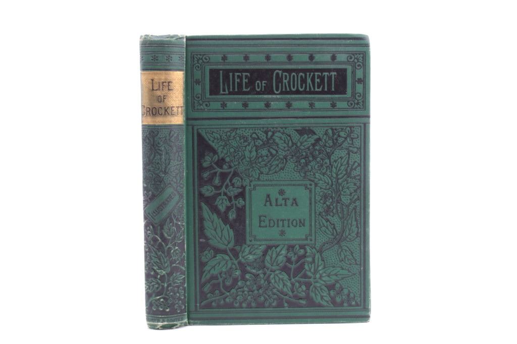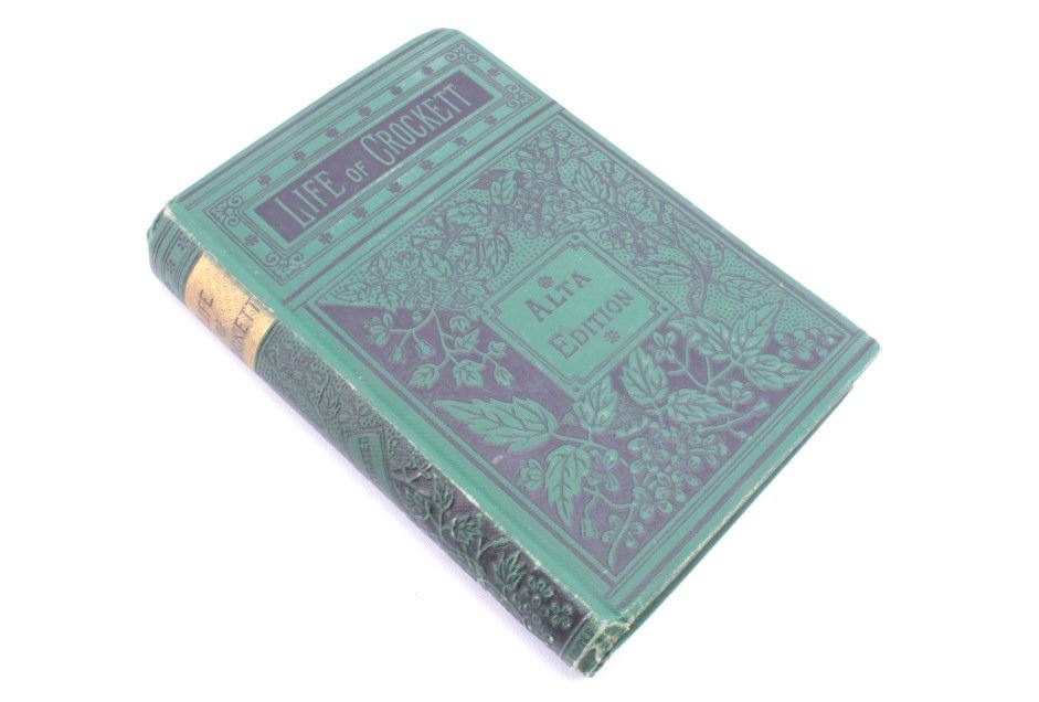 For your bidding pleasure is this copy of “The Life of Crockett”, Alta Edition, by Ellis, 1884. The "Alta Editions" were published by a group called Coates and Porter, who were from Philadelphia. The book chronicles the life and adventures of the scout, hunter, woodsman, and congressman. The book has a wonderfully decorated cover and shows good condition. The book measures 5 1/2" x 7 1/2" x 1".