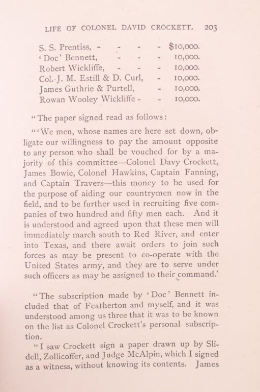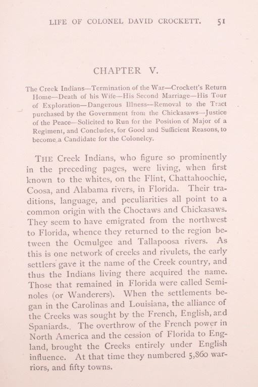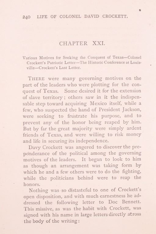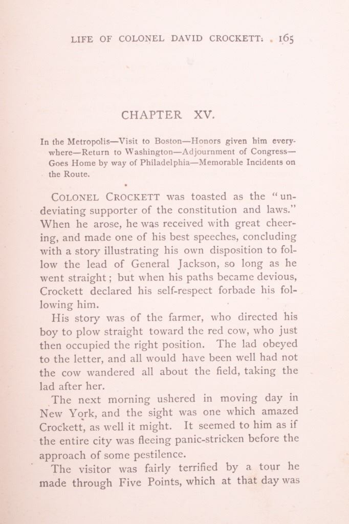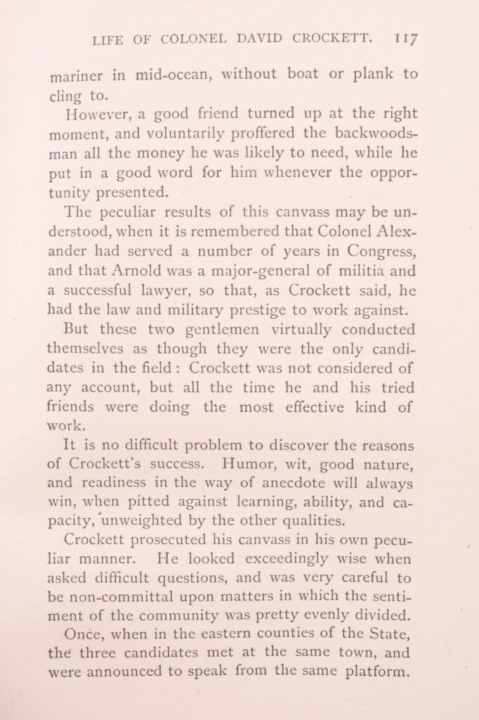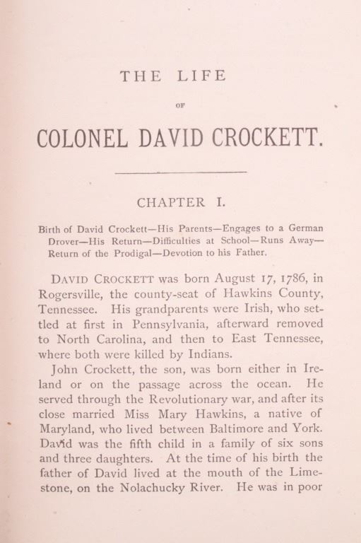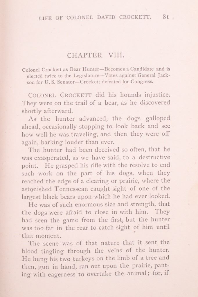 For your bidding pleasure is this copy of “The Life of Crockett”, Alta Edition, by Ellis, 1884. The "Alta Editions" were published by a group called Coates and Porter, who were from Philadelphia. The book chronicles the life and adventures of the scout, hunter, woodsman, and congressman. The book has a wonderfully decorated cover and shows good condition. The book measures 5 1/2" x 7 1/2" x 1".