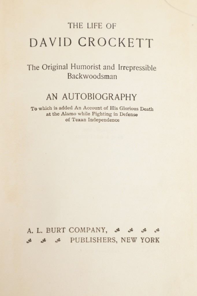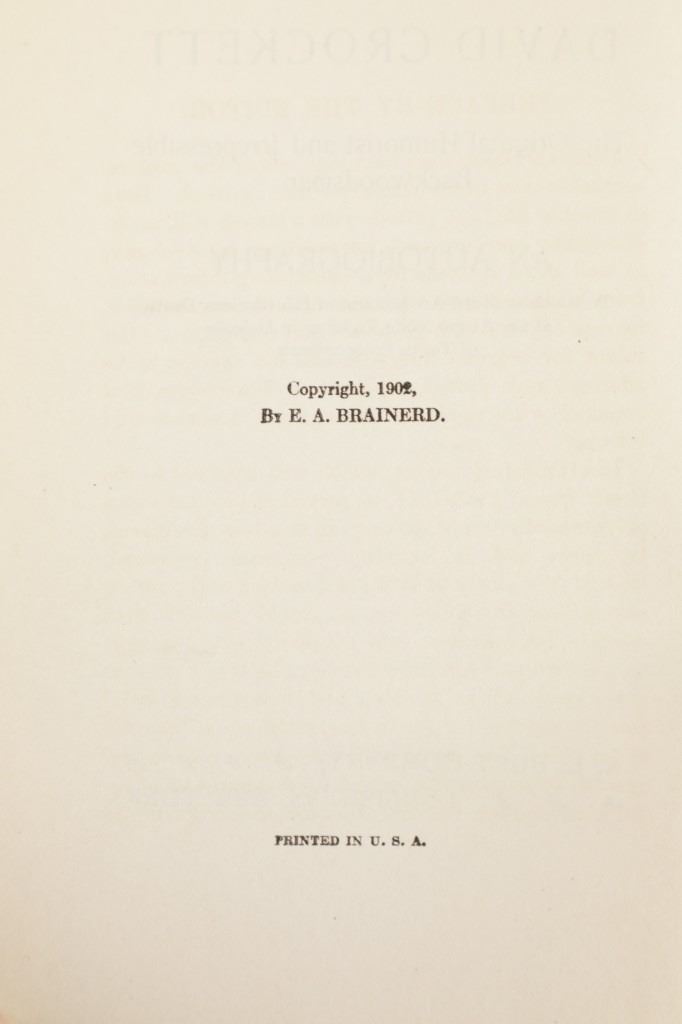 For your consideration is a First Edition of "The Life of David Crockett: The Original Humorist and Irrepressible Backwoodsman", published by Grosset & Dunlap, New York and copyright by E. A. Brainerd, 1902. This is an autobiography with illustrations and introduction by G. Mercer Adam, to which is added an account of Crockett’s glorious death at the Alamo while fighting in defense of Texan independence. "Davy" Crockett was an American folk hero, frontiersman, soldier, and politician. He is often referred to in popular culture as the "King of the Wild Frontier". He represented Tennessee in the U.S. House of Representatives and served in the Texas Revolution. The red cloth bound stamped hardcover is in good condition overall, slight scuffing to edges, loose spine. Intact top edge painted pages exhibit age tanning, moisture staining observed, no other marring observed. Measures approximately 5.5"W x 8.25"L x 1.5"D, weight is 1lb, 2oz.
