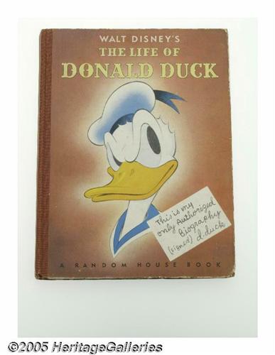 <B>The Life of Donald Duck (Random House, 1941) Condition: VG.</B></I> One of the most desirable of the early Donald Duck books, this keen 1941 Random House hardcover is Donald's "only Authorized Biography". Featuring both color and black and white illustrations, it also features guest appearances by Geppetto and Huey, Dewey and Louie! No Duck collection is complete without this one! Binding is solid, paper quality is quite acceptable. There is a name/date written on back of inside cover, and the first interior page (before title page) is missing. Covers show edge/corner wear, bit of scuffing, light overall wear. Solid copy of a major Disney book! <I>From the Larry Jacobs Collection.</B></I>