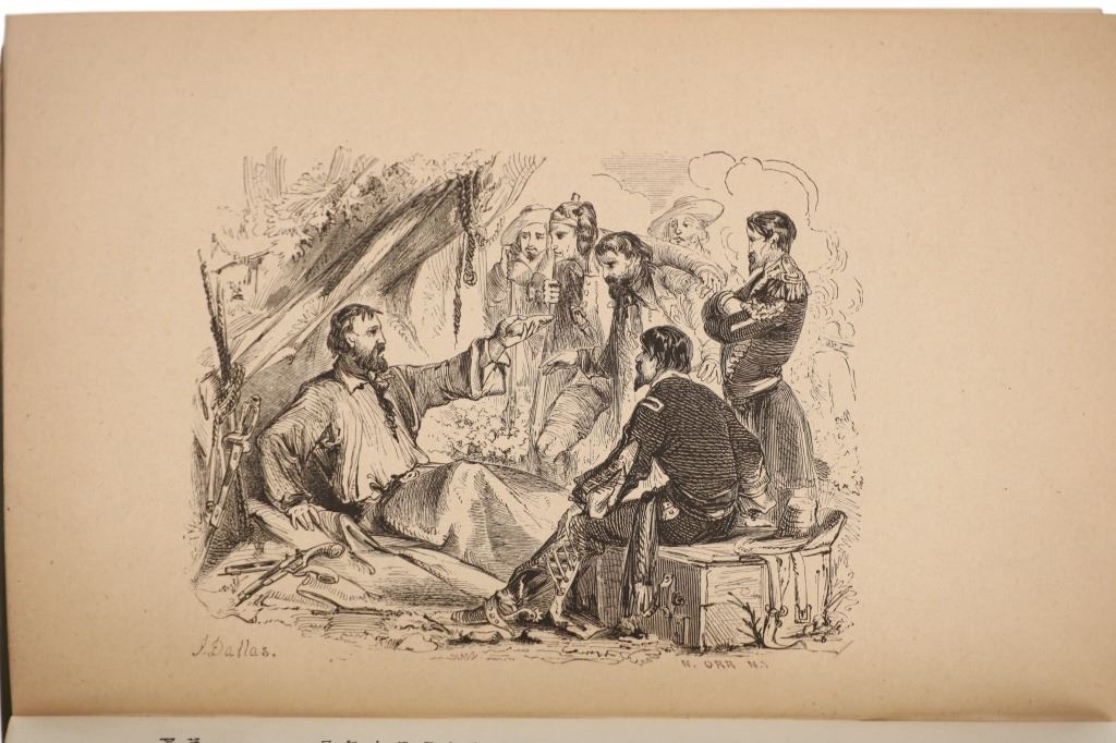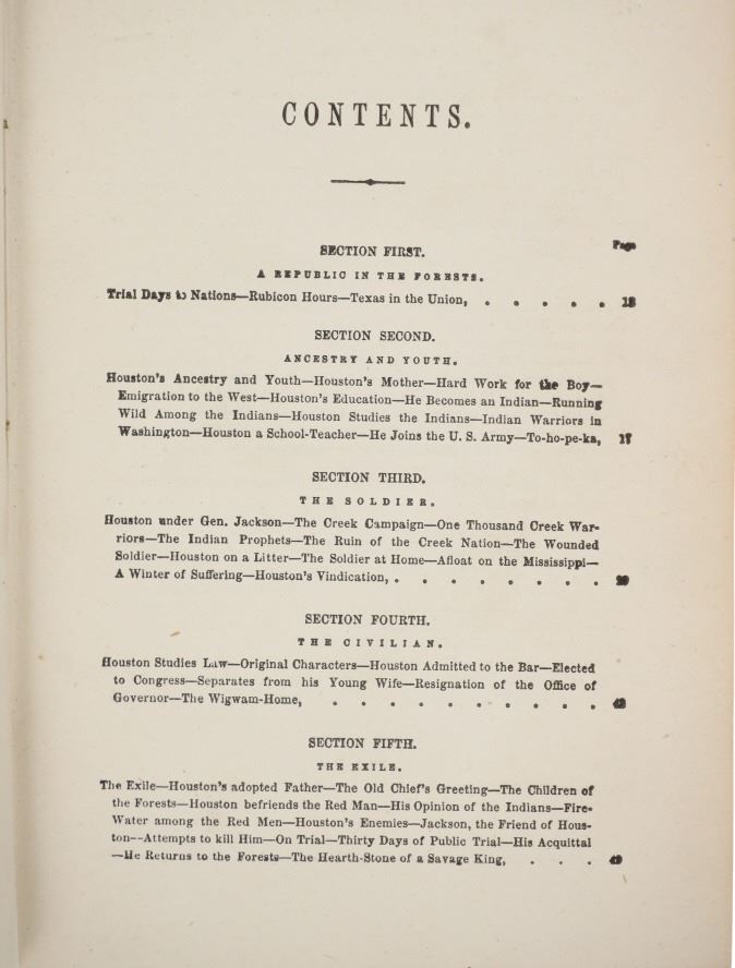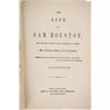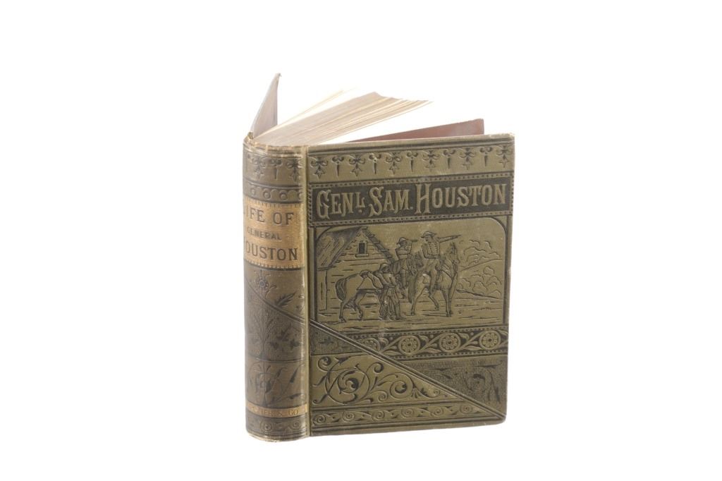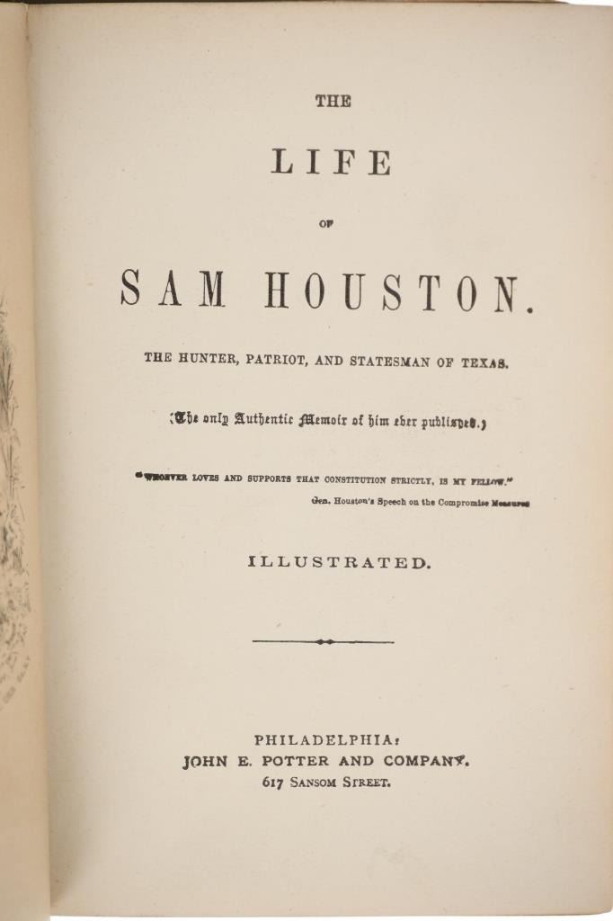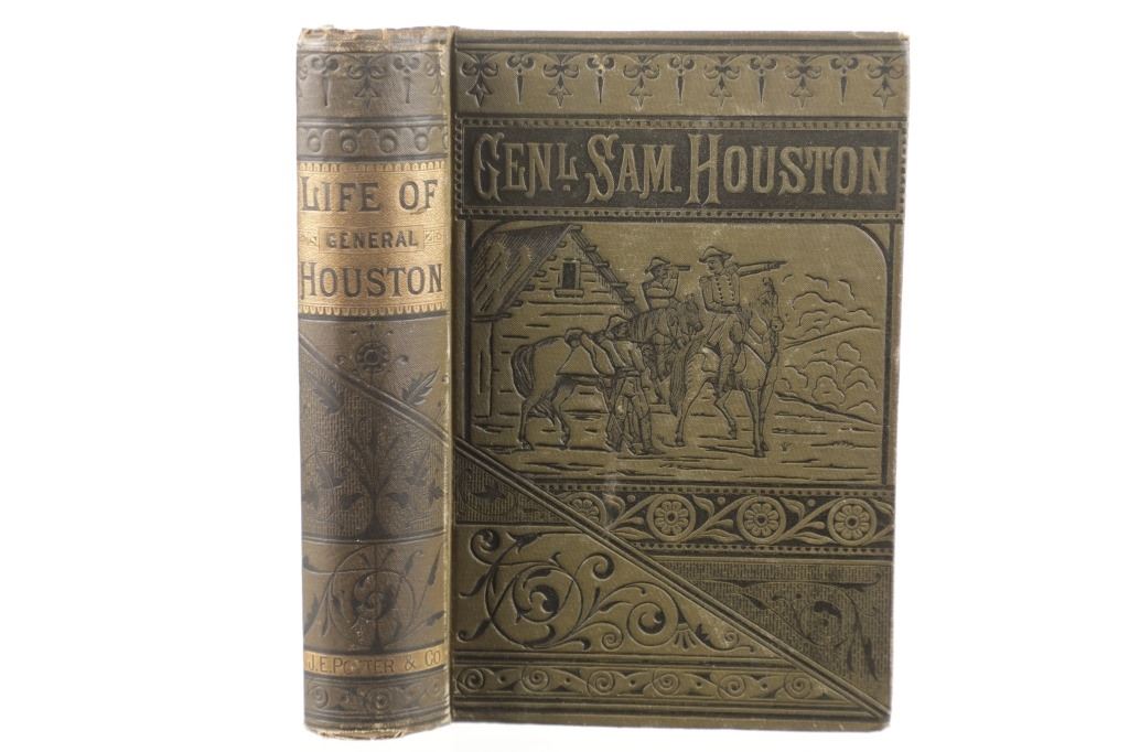 This lot features a Rare 1867 First Edition, "The Life of Sam Houston", by Charles Edwards Lester, published by John E. Potter and Company, Philadelphia, PA. "The Life of Sam Houston; The Hunter, Patriot, and Statesman of Texas, The Only Authentic Memoir of Him Ever Published." Samuel Houston was an American general and statesman who played an important role in the Texas Revolution. He served as the first and third president of the Republic of Texas and was one of the first two individuals to represent Texas in the United States Senate. Charles Edwards Lester or C. Edwards Lester (1815-1890) was an American author and diplomat. Lester was born in Griswold, Connecticut, and was a descendant of Jonathan Edwards. He was of a roving disposition and traveled widely in the United States and Europe. The olive coloured clothbound stamped gold gilt hardcover is in nice condition with an illustrated carved floral cover design with vignette of Houston on horseback on front cover. Scuffing noted to cover edges. Intact pages exhibit age tanning and slight foxing. Measures 7.5"L x 5.25"W x 1.5"D, and the weight is 1lb 6oz.*