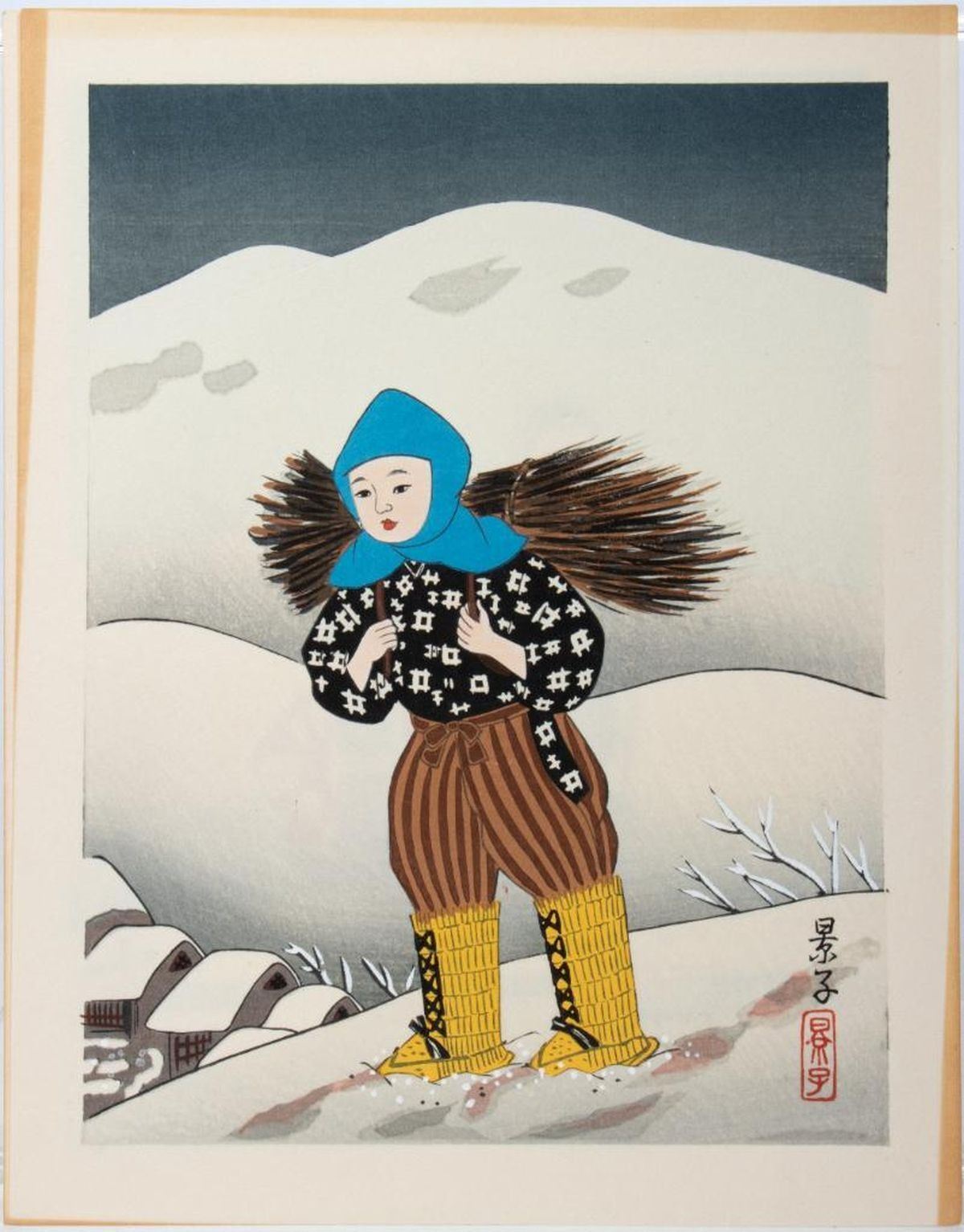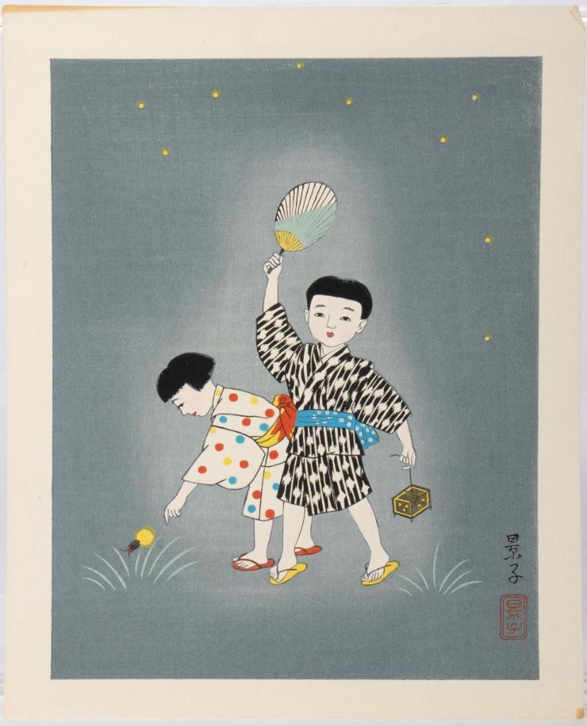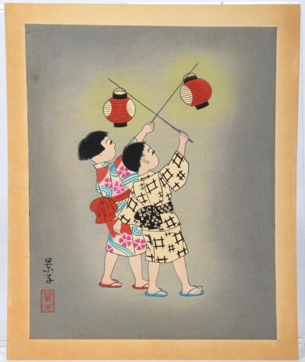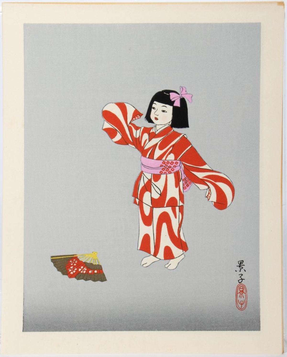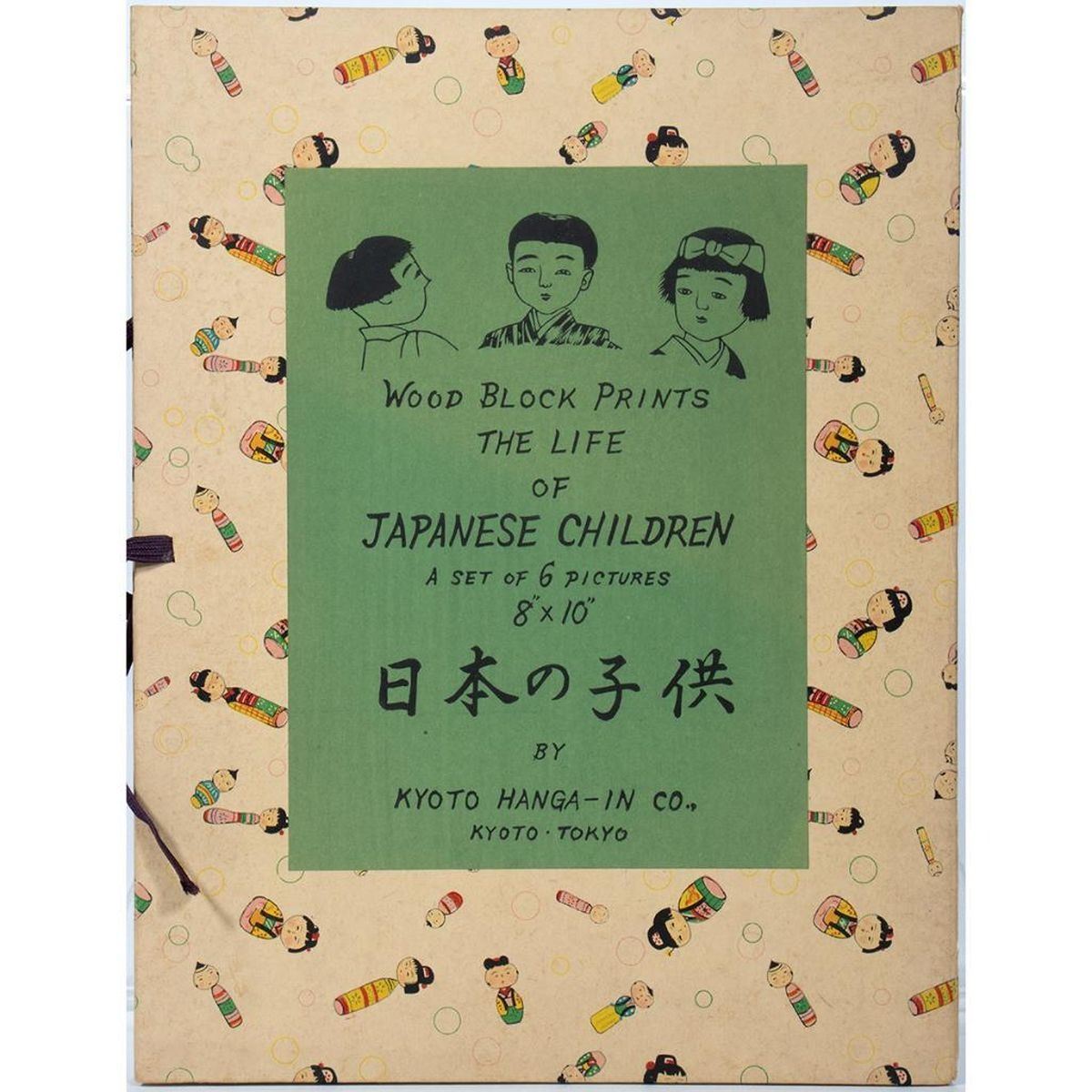 The Life of Japanese Children, wood block prints by Japanese artist Keiko Yurimoto, published by Kyoto Hanga-In Co., Tokyo, 1957. A set of six woodblock prints in a three-fold portfolio, the woodblock prints have been heightened with "bakashi" shading; light "gauffrage", a heavier black ink has been applied to children's hair, clothing and eyes, the overall effect looks much like pochoir. The plates near fine in a like color illustrated portfolio.