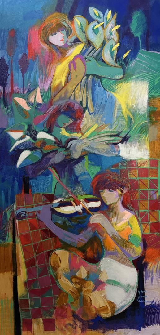 This magnificent original oil artwork, a striking blend of colors and forms, is meticulously created on canvas and hand-signed by the artist. Art size 27x59" framed size 29x61"