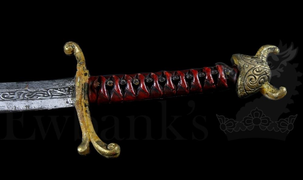 † The Lion the Witch and the Wardrobe (2005) A stunt prop Sword made for the Faun red armoured Soldiers in the trilogy of The Chronicles of Narnia films.Such style of Swords can be seen wielded by Faun Soldiers during battle sequences. Constructed of a well detailed dense hard rubber material, painted to emulate steal and leather. Please note that VAT is payable on top of the hammer price at 20% in addition to standard buyers premium inc. VAT for this lot.