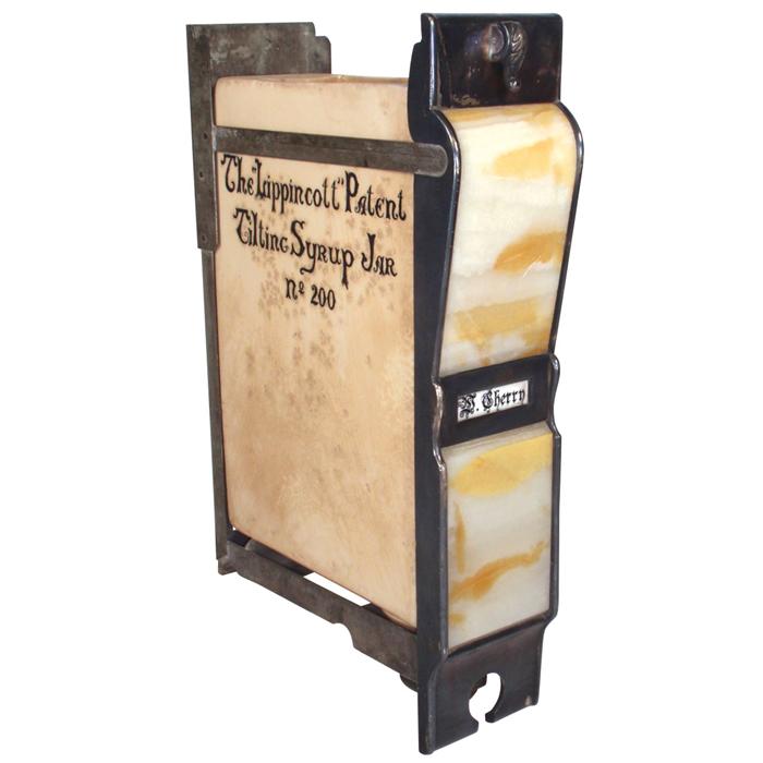 The Lippincott Patent Tilting Syrup Jar No. 200 w/German silver frame, early stoneware body w/agate