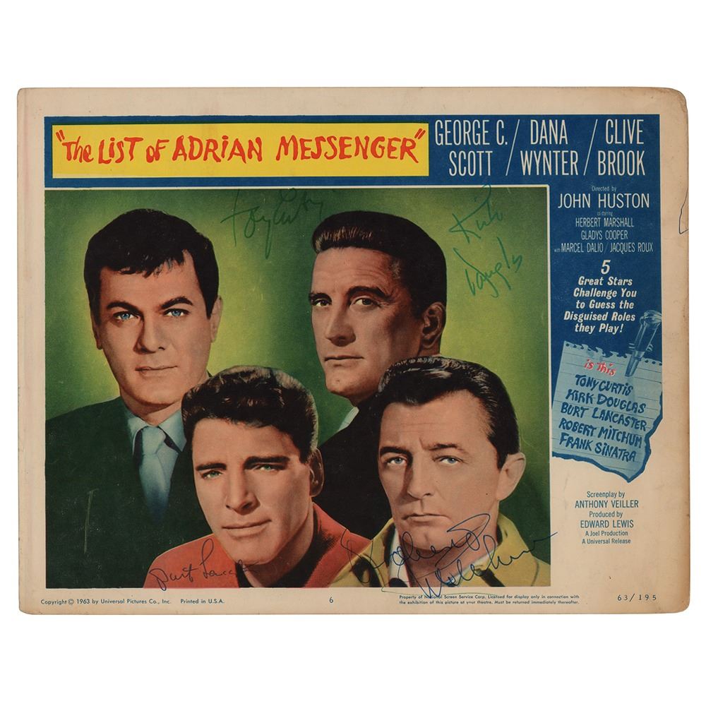 Original color 14 x 11 lobby card for the 1963 American mystery film The List of Adrian Messenger, signed in felt tip by Kirk Douglas, Robert Mitchum, Burt Lancaster, and Tony Curtis. Pencil collector's notations on the reverse denote where each signature was obtained. In fine condition, with wear to the corners.