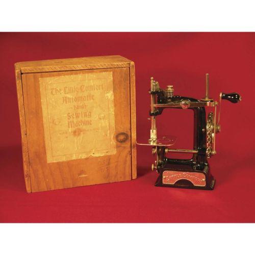 The Little Comfort Automatic Hand Sewing Machine, in original wood box with instruction booklet, needles and table top clamp. Cast iron, excellent condition. 7 1/2 X 7 X 3 inches.