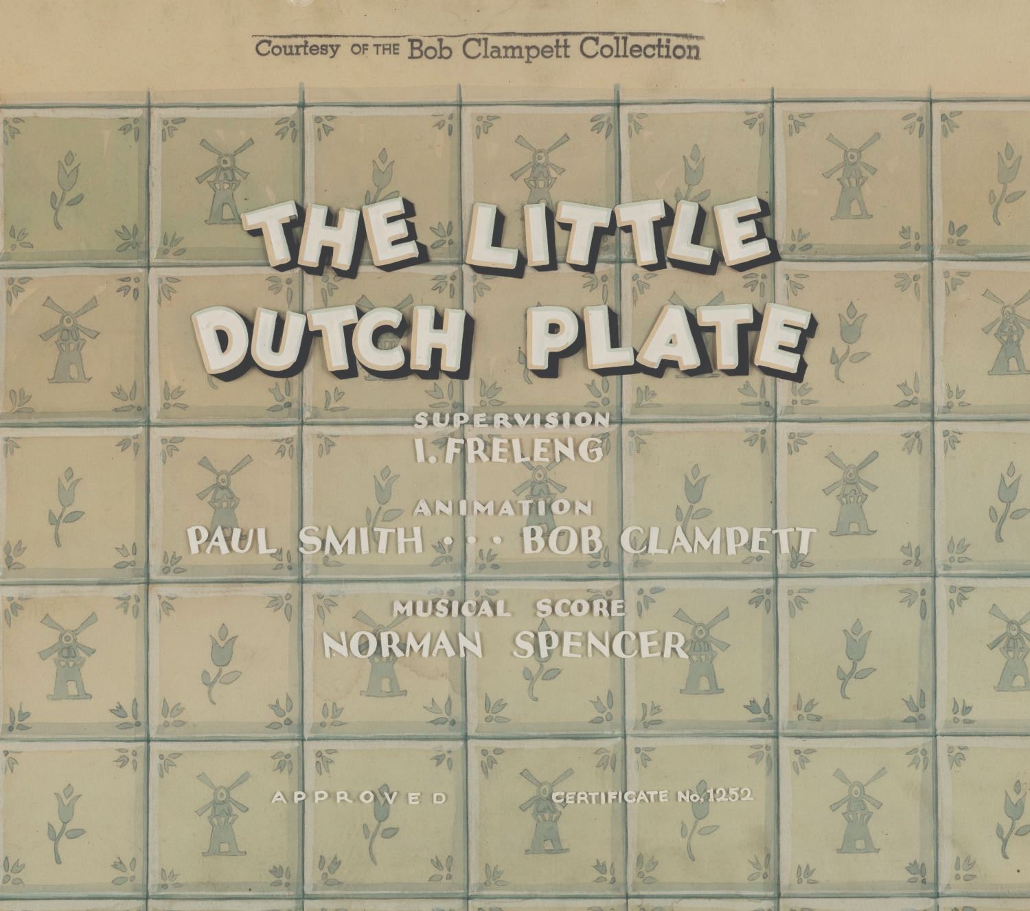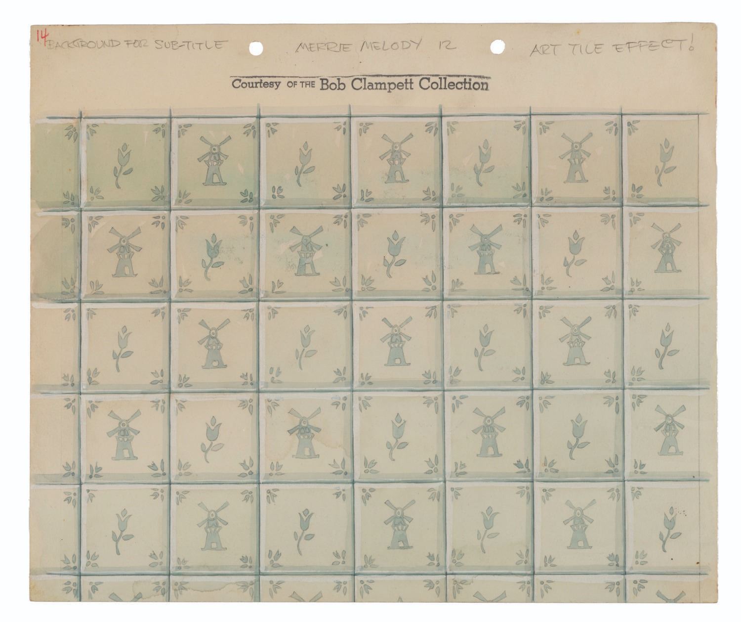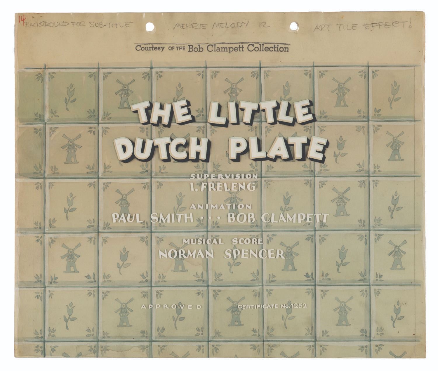 (Schlesinger, 1935) The title card painting for the Merrie Melodies short “The Little Dutch Plate.” The film elements for this short’s titles were lost when it was reissued in 1953 under the “Blue Ribbon” series, replaced by the short’s title in plain text over a background featuring a blue ribbon and Grand Shorts Award trophy. This original artwork has not been seen by the public for over 80 years, and is an incredibly rare and valuable piece of Warner Bros. animation history. Measuring 9.5” x 11.25” the artwork accomplished in gouache and cel paint is in good production-used condition with light warping to the text cel layer, light edge wear, and light discoloration from age to the background layer.