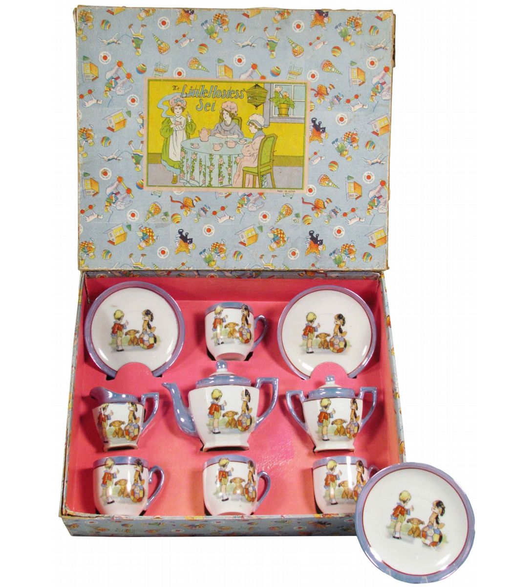 "The Little Hostess" Children's Tea Set in original box. Box shows wear otherwise excellent condition. 13 1/2 X 3 1/2 X 11 inches.