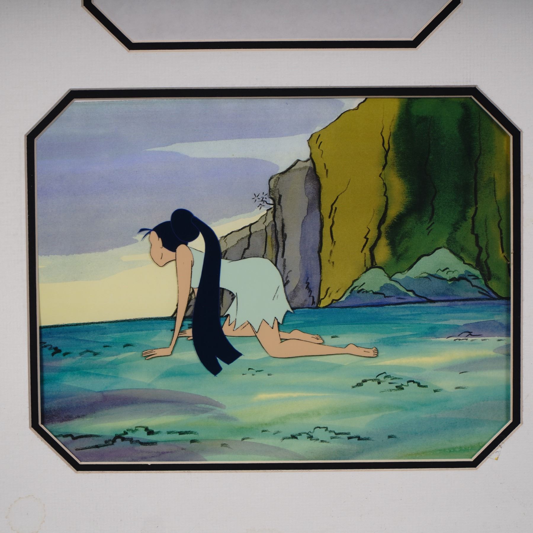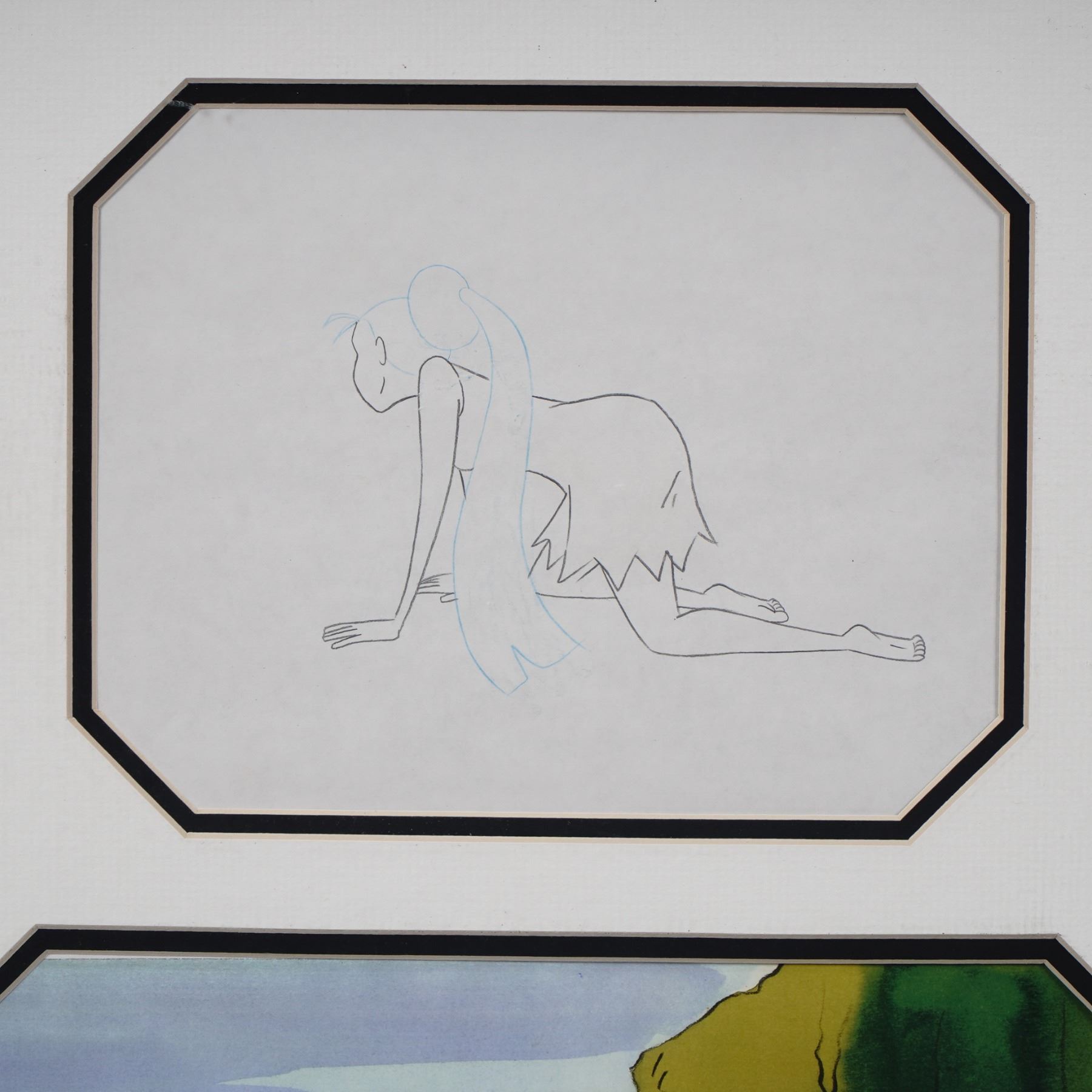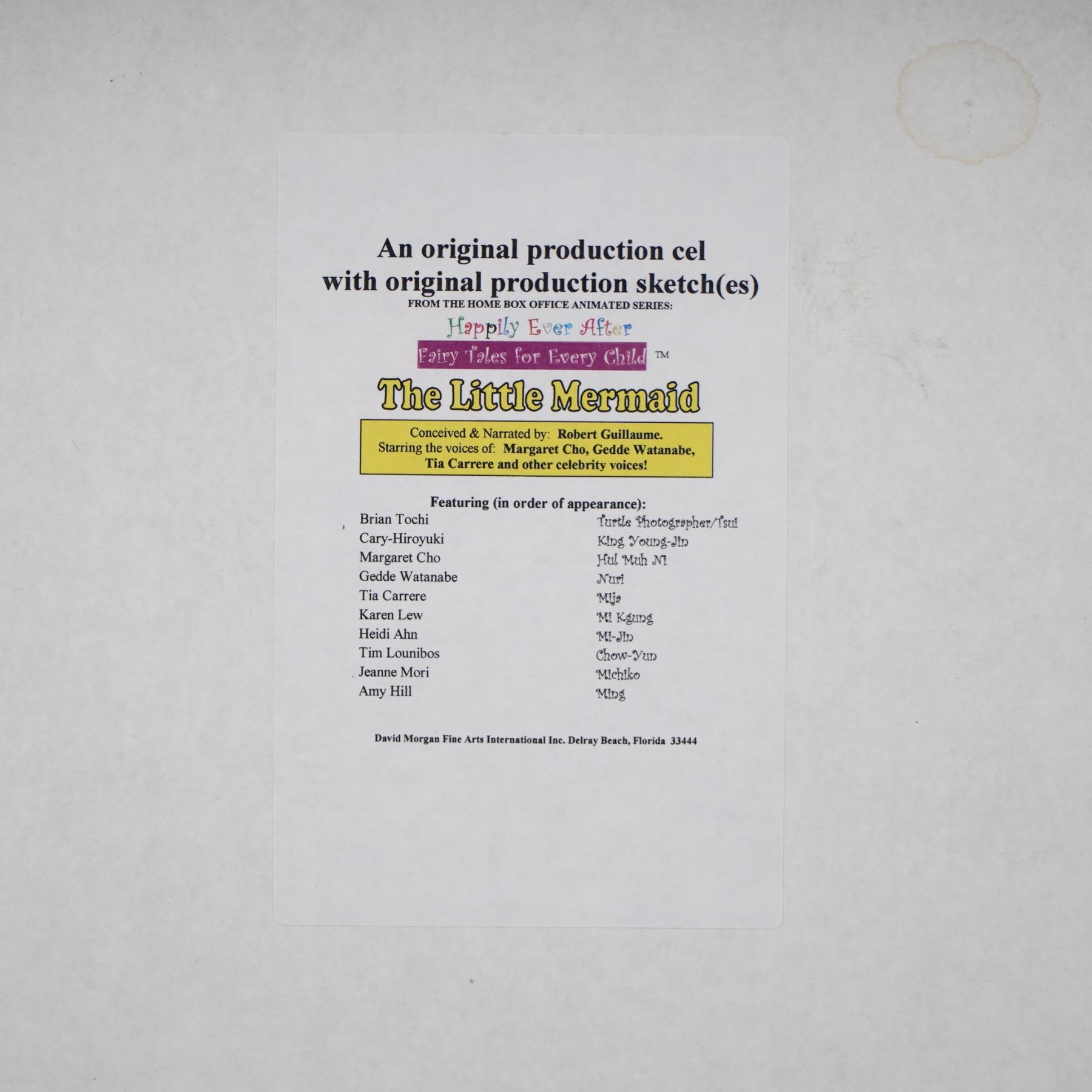 An original production cel paired with a matching production drawing from the animated HBO series Happily Ever After: Fairy Tales for Every Child, specifically the episode The Little Mermaid. The cel and drawing depict the main character in a distinctive pose against a vivid seaside background, exemplifying the show's unique artistic style. The piece comes professionally matted and includes a printed sheet on the reverse listing the episode's cast and was produced by David Morgan Fine Arts International, Delray Beach, Florida. Happily Ever After: Fairy Tales for Every Child was an award-winning animated anthology series created by HBO in the 1990s. The show reimagined classic fairy tales with diverse cultural settings and cast of voice actors, emphasizing inclusion and representation in children's media. The Little Mermaid episode featured a Polynesian reinterpretation and starred notable talents including Margaret Cho and Tia Carrere.