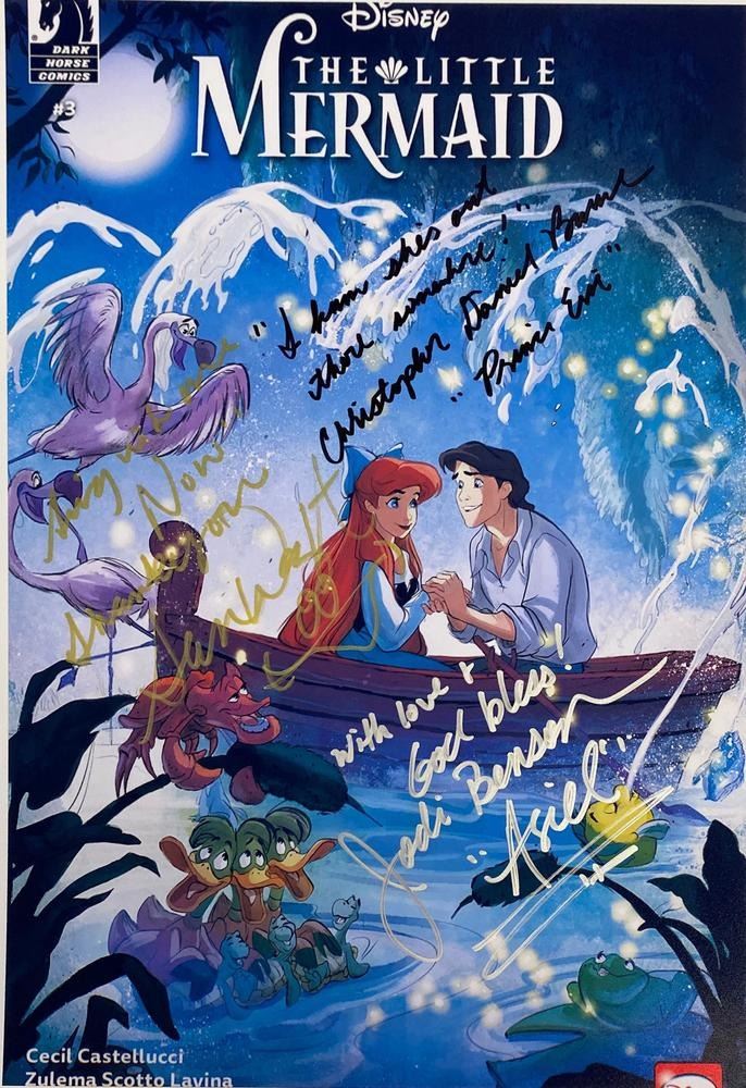 The Little Mermaid cast facsimile signed movie photo autographed by Jodi Benson, Christopher Daniel Barnes and Samuel E. Wright. 8x10 inches. This item is a reprint of an original autograph