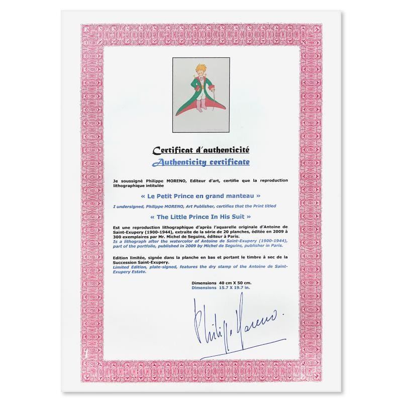 "The Little Prince In His Suit" is a limited edition lithograph by Antoine de Saint-Exupery (1900-1944), bearing the plate signature of the artist. This piece comes from an edition of 300 authorized by the Exupery Estate, but the pieces in this edition are not individually numbered. Includes Certificate of Authenticity. Measures approx. 21.5" x 25.5" (frame), 15.5" x 19.5" (image).
