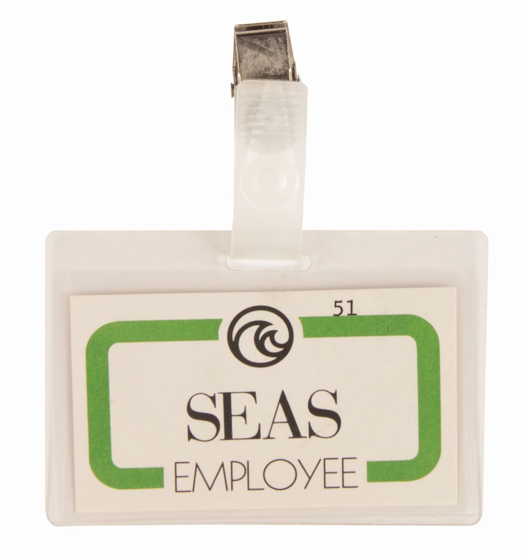 (Epcot, 1982) A very rare employee credential badge worn by an employee of The Living Seas pavilion during Epcot's opening year. The badge features the logo for the pavilion, the number 51, and the title "Seas Employee." The reverse of the badge has Walt Disney Productions copyright and use information, and the badge measures 2.25"x3.25", not including the clip. The condition is very good with minor surface wear from use.