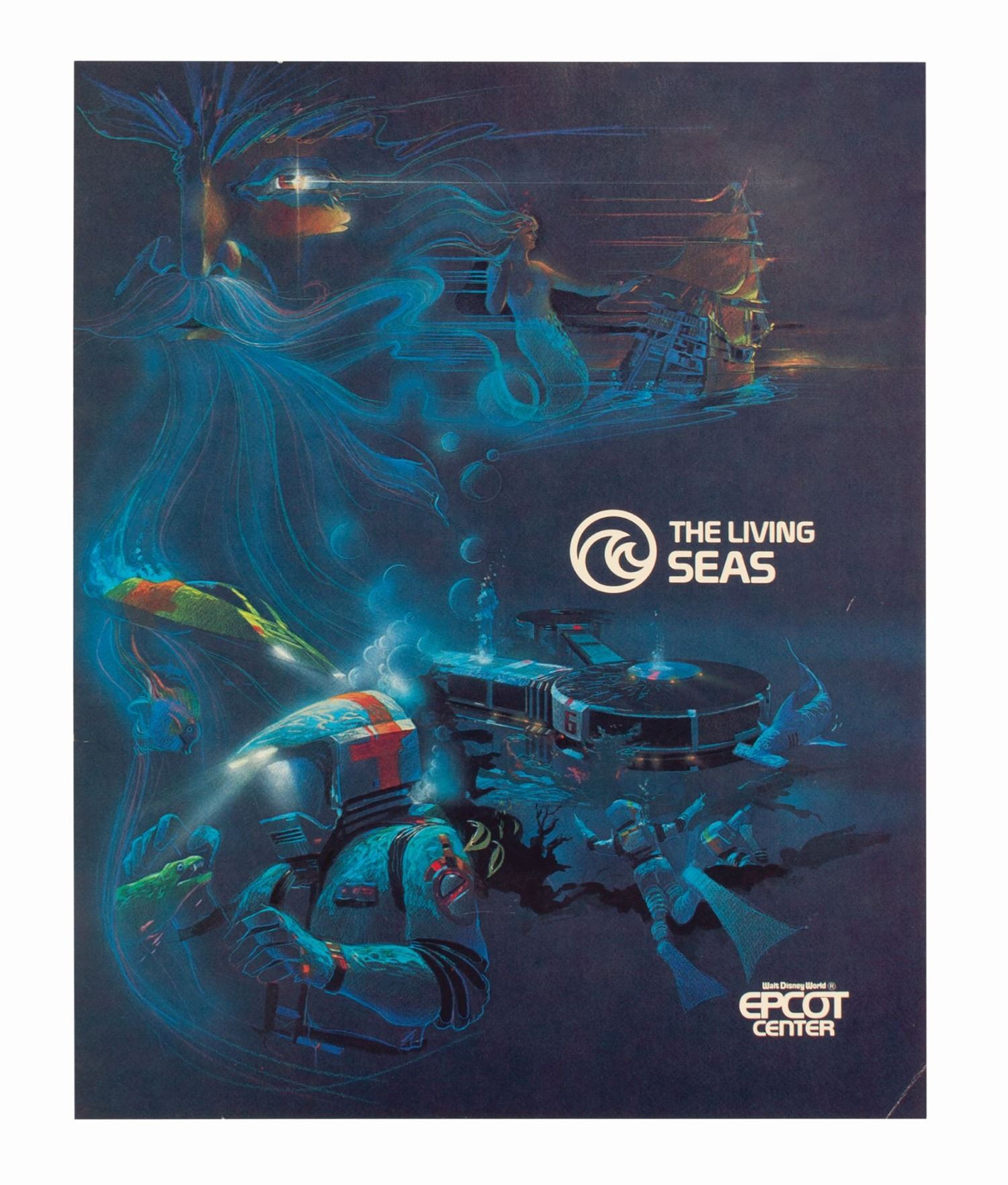 (Epcot, 1981) A vintage fold-out brochure promoting The Living Seas attraction. The 3-page double-sided brochure touts the technological and engineering achievements of the aquarium, which, with a capacity of 5.7 million gallons, was the largest in the world from 1986 until 2005, as well as the attraction’s research possibilities and corporate event potential. The SeaBase Alpha experience is teased through futuristic concept paintings, presenting the entire undertaking as a modern marvel. Measuring 11”x8.5” folded, the brochure is in very good condition with minor fold wear and handling.