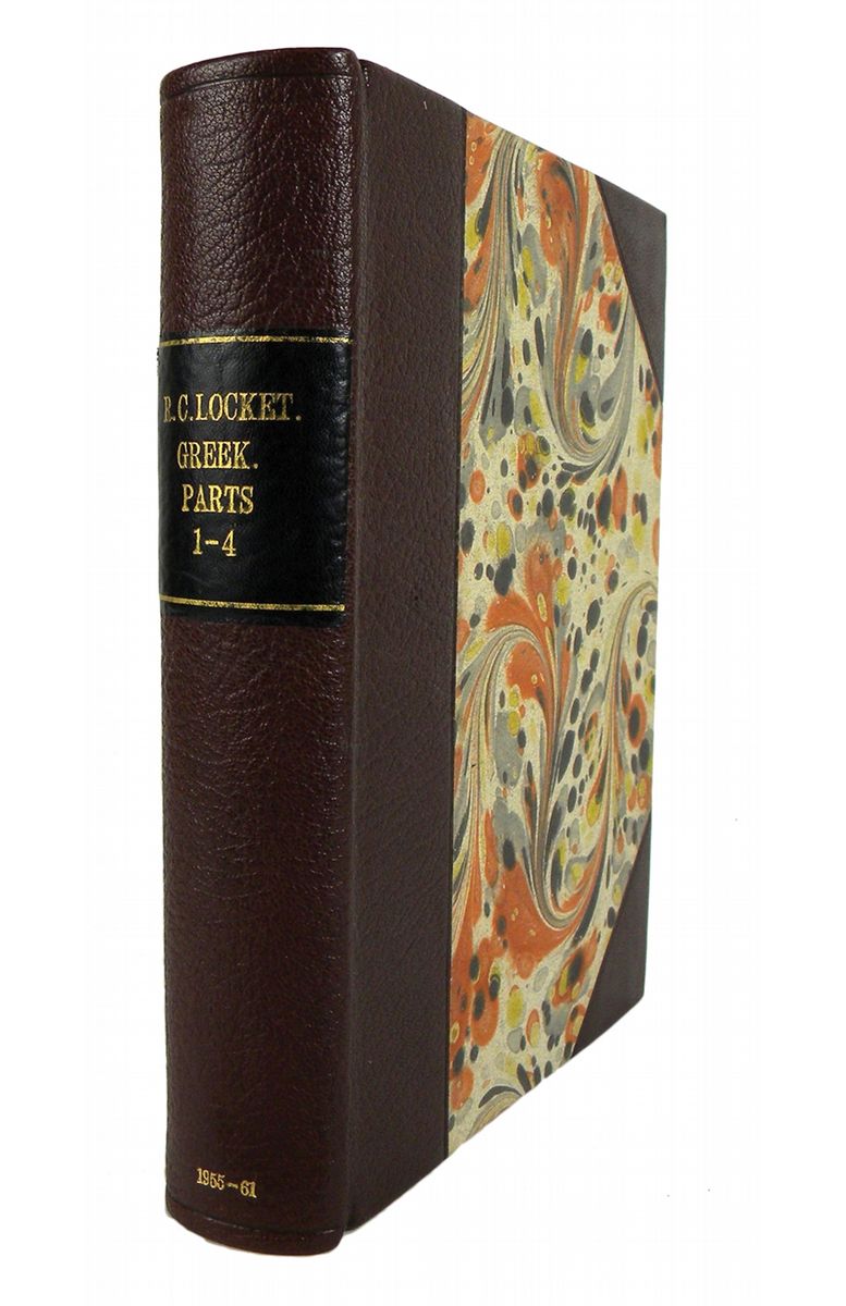Glendining & Co. CATALOGUE OF THE CELEBRATED COLLECTION OF COINS FORMED BY THE LATE RICHARD CYRIL LOCKETT, ESQ. GREEK: PARTS I-IV. London, 1955-61. Four parts complete, bound in one volume. 8vo, attractively bound in later brown half morocco with marbled sides; black spine label, gilt; original printed card covers bound in. 130; 83, (1); 67, (1); 118, (2) pages. 3125 lots; 38 + 23 + 15 + 35 fine plates of coins. Fine. A highly important series of sales, indispensable to collectors and students of ancient Greek coins. Clain-Stefanelli 1971*. Daehn 2047. Grierson 284. Spring 232-235 [also listed under "Most important sales of ancient Greek coins"].