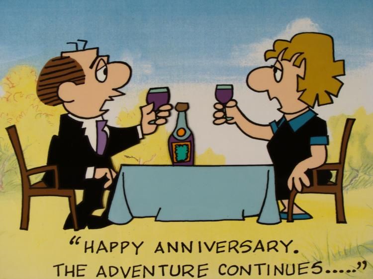Here is an original animation model cel was used in the production of the cartoon the Lockhorns. * This lovely couple is enjoying their wine and celebrating there anniversary together. The caption on the cel reads: "HAPPY ANNIVERSARY.&nbs