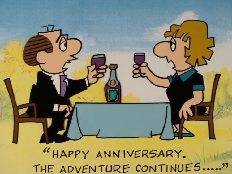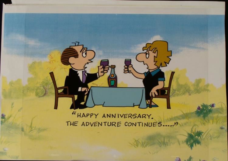 Here is an original animation model cel was used in the production of the cartoon the Lockhorns. This lovely couple is enjoying their wine and celebrating there anniversary together. The caption on the cel reads: "HAPPY ANNIVERSARY. THE ADVENTURES CONTINUE....." Original Animation Cel & Printed Background Medium: Hand painted acetate celDetails: Animation notations and peg holes Size of cel: 10 1/2 x 12 1/2 inchesSize of background: 11 x 15 inches Condition: Very good; slight tear in corner of background This is an original hand-painted cel set-up used in the production of "The Lockhorns." Each one-of-a-kind set-up represents a slight change in position of the characters. When individually photographed and projected in rapid succession, the images appear to move. To create production cels, the original animator's drawing is transferred onto an acetate cel (by hand-inking and/or photo copying). The cel is then hand-painted on the reverse side. The background accompanying this set-up is a printed reproduction background.