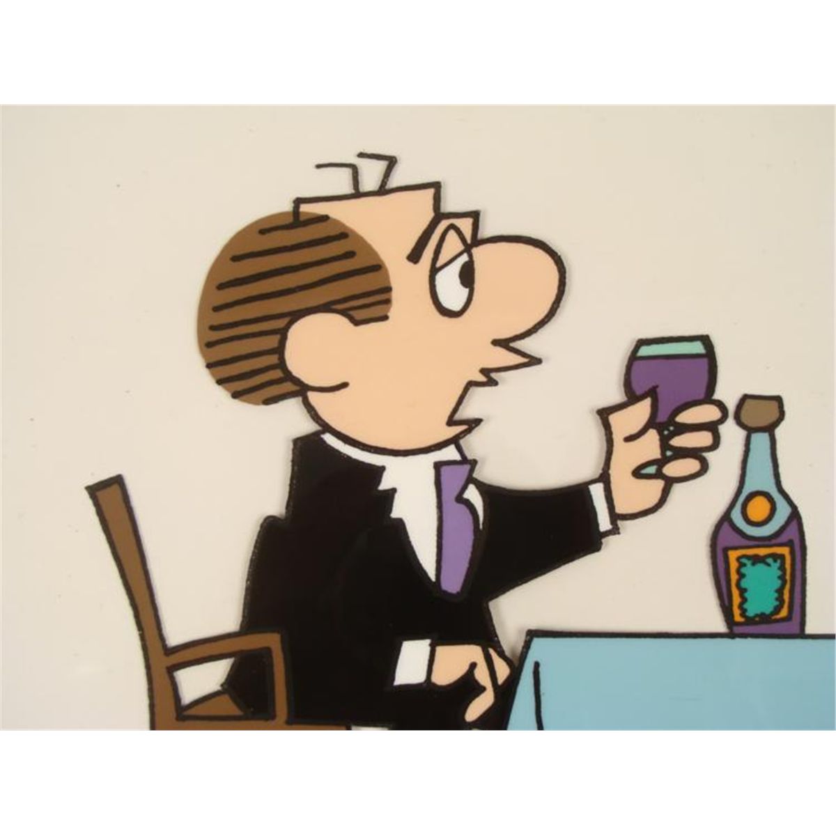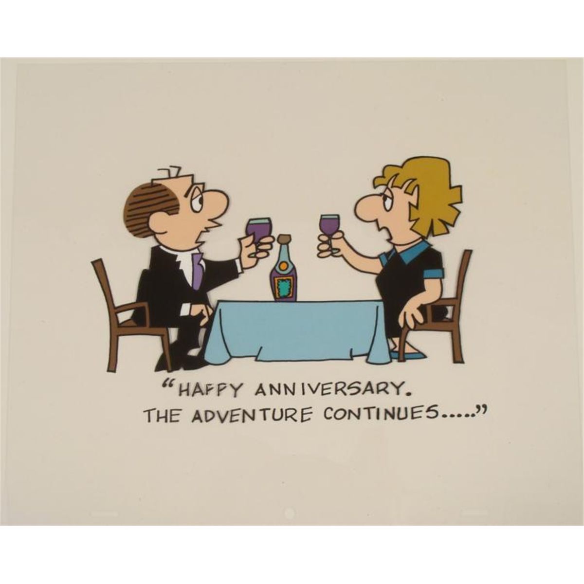 Here is an original animation model cel was used in the production of the cartoon the Lockhorns. This lovely couple is enjoying their wine and celebrating there anniversary together. The caption on the cel reads: "HAPPY ANNIVERSARY. THE ADVENTURES CONTINUE....." * * Medium: Hand painted cel acetate Size: 10 1/2 x 12 1/2 inchesCondition: Excellent