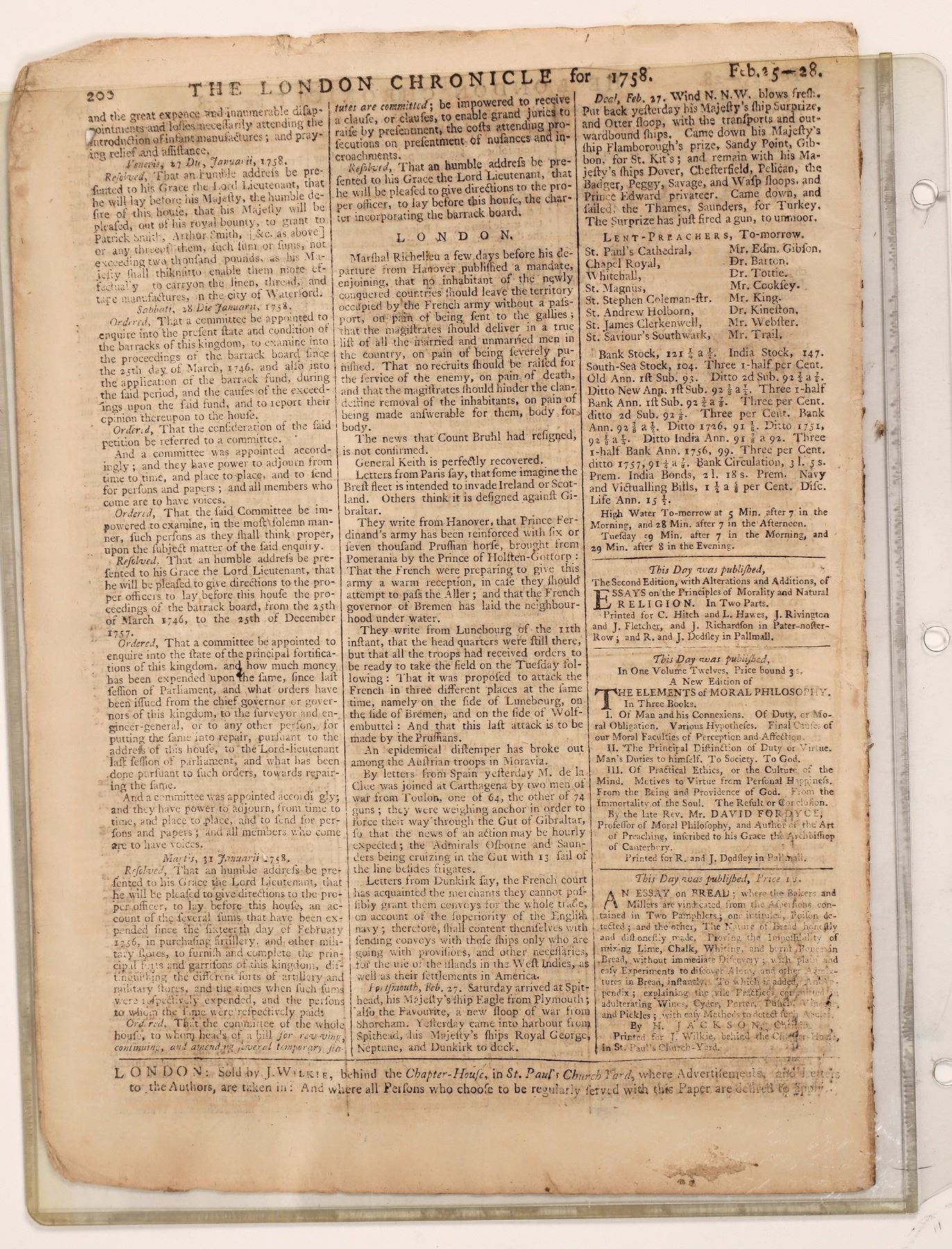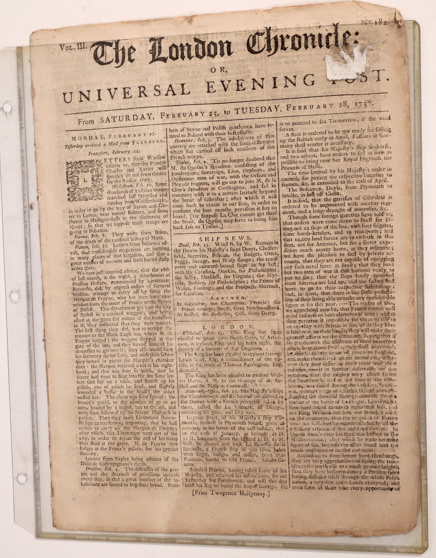 Vol. III, No. 182, February 25-28, 1758. 8pp. 11.5 x 8" News from London, Ireland, and one paragraph report from Charleston, South Carolina. American news is about the number of ships arriving and departing, picking up French produce to take back to Europe. Also the arrival of a French marque ship, Les Animable Marthe, with a cargo of sugar, cotton, and coffee. Twenty years before the American Revolution!