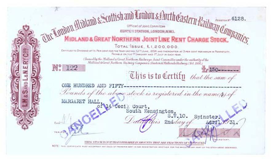 1931, London, England. Midland & Great Northern Joint Line Rent Charge Stock. Brown/Red. Litho. Stock certificate for 150 Pounds. Stamp and Punch cancelled.