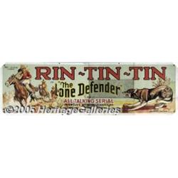 <B>The Lone Defender (Mascot, 1930)</B></I> Banner (35.5" x 118"). Rin Tin Tin's prospector owner is killed by a gang trying to find his hidden gold mine. After being cleared of killing an expensive horse, Rinty is captured by the gang, who want him to lead them to the mine. With the help of a government agent, his sidekick and the miner's daughter, Rinty is able to save the day. Beautiful stone lithograph artwork of Rin Tin Tin and cowboys on weatherproof muslin. Fold wear with some separation and loss of material. Extensive soiling on two of the panels. All four corners are folded back and held in place with the corner grommets. Two other grommets are on the top and bottom edges. Fine+.