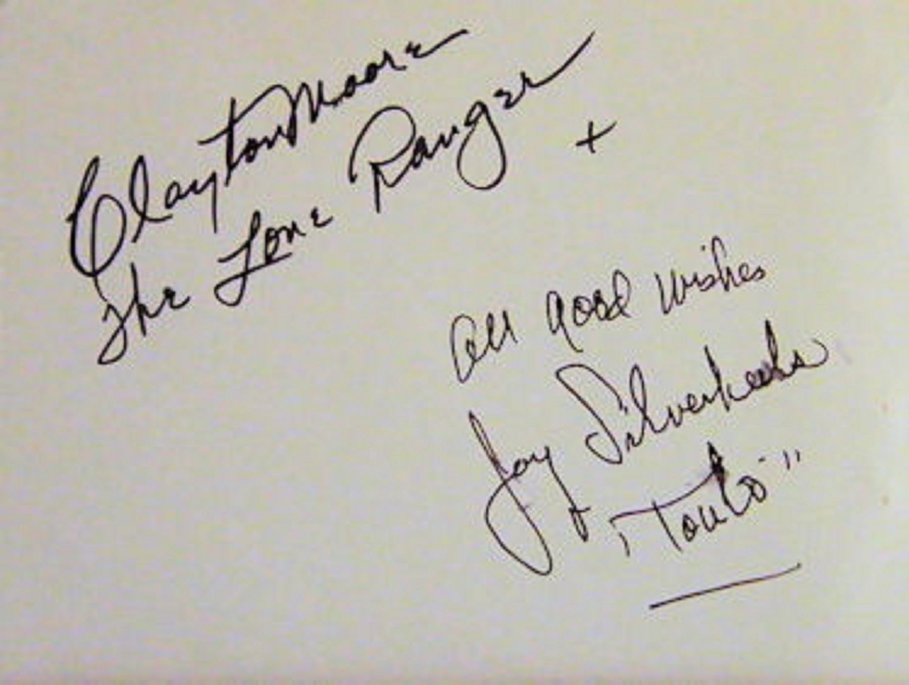 6 in. x 4 1/2 in. slip signed Clayton Moore The Lone Ranger + All Good Wishes Jay Silverheels ‘Tonto’