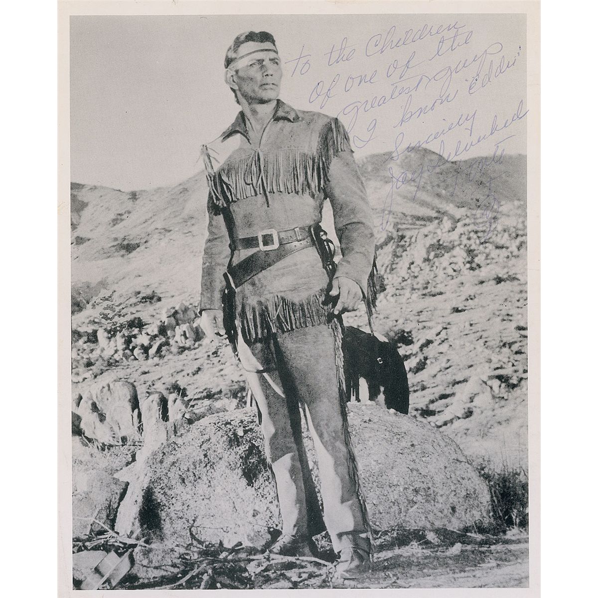 Nice 8 x 10 paperstock full-length photo of Silverheels as Tonto, signed and inscribed in blue ballpoint, “To the children of one of the greatest guys I know ‘Eddie,’ Sincerely, Jay Silverheels, Tonto,” adding a symbolic version of his name underneath. In fine condition.