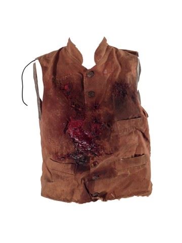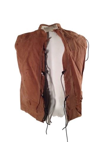 The Lone Ranger (2013)-screen worn, production acquired, tan vest with large open sfx created wound soiled by production and created to appear as a gunshot wound on the front of the vest. A really amazing special costume custom made for the film!