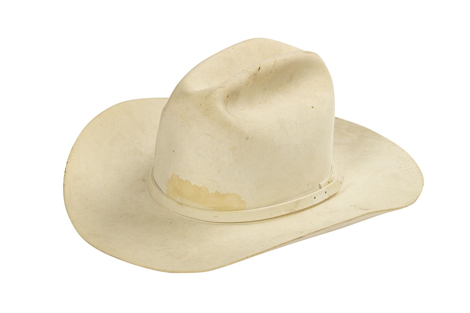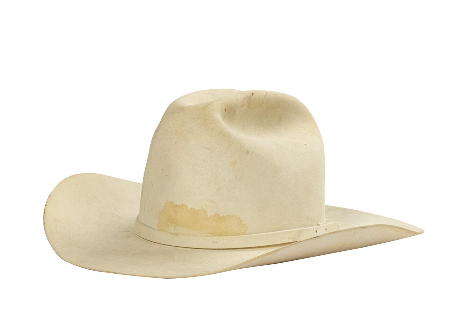 (Disney, 2013) A customized white beaver and cashmere Stetson cowboy hat worn by Armie Hammer as the title character in The Lone Ranger. The backside of the sweatband retains a milliner’s label printed, “Hammer” along with job number and hat attributes. The 6 ¾ size label is present, and the hat is additionally marked 6 ¾ in felt pen on the interior of the crown. In good production used condition, the hat exhibits moderate studio distress and soiling overall. The fastener has been intentionally removed from the white self-cover hatband, which was adhered to itself but has become unglued.