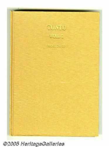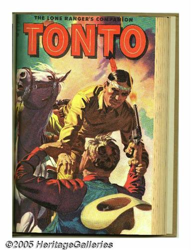 <B>The Lone Ranger's Companion Tonto and Famous Horse Hi-Yo Silver Bound Volumes (Dell, 1951-59).</B></I> Three volumes featuring <B>The Lone Ranger's Companion Tonto</B></I> and one volume of <B>The Lone Ranger's Famous Horse Hi-Yo Silver</B></I> make up this group. The Tonto issues include #2-33; the Silver volume includes #18-29. The art in these books is incredible, especially the richly painted covers for each issue. All the comic books in these sets were Dell file copies that were bound and trimmed into reference books for office use. Many of the books have retained their like-new quality. Approximate Overstreet VG 4.0 value for group = $400. <I>From the Random House Archives.</B></I>