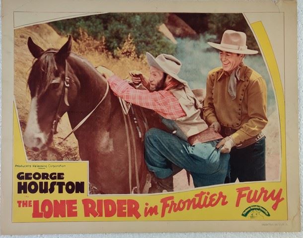 The Lone Rider in Frontier Fury (Producers Releasing Corp., 1941) lobby card. Western. Starring George Houston, Al St. John, Hillary Brooke. Directed by Sam Newfield. Some edge wear, some creases, light stains, some tears. Fine. (11"x14").