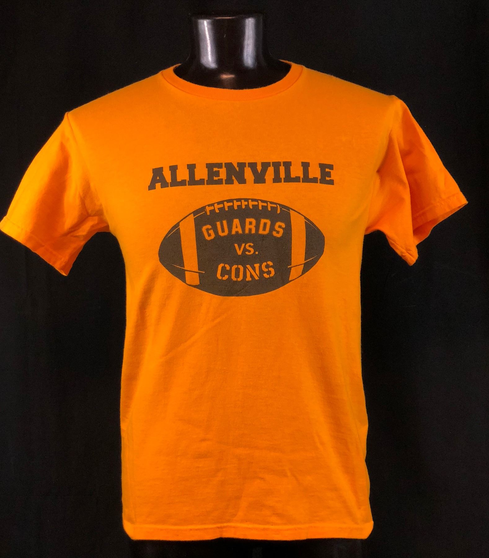 Original Allenville "Guards VS. Cons" orange shirt from the big prison football game used in the sports prison comedy film "The Longest Yard" (2005), where prison inmates form a football team to challenge the prison guards. Starring Adam Sandler, Burt Reynolds, Chris Rock. The film would go on to gross $158.1 million in the United States and Canada and $190 million worldwide.