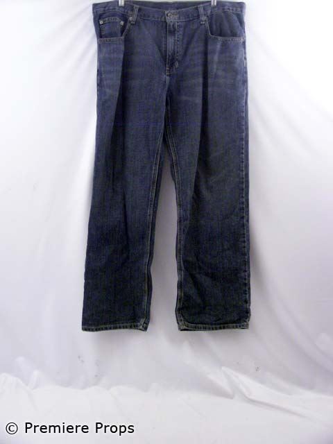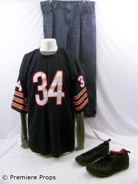 Curtis' (Ice Cube) navy w/ white / orange trim numbers/letters "34" center front / "Payton 34" center back "Mitchel and Ness" s/s crew neck football jersey (size 2XL), medium blue denim "Merona" jeans (size 40 x 30), mushroom brown thermal "Cherokee" l/s crew neck t-shirt (size L), black perforated suede w/ black stripes "Adidas" sneakers (size 12)