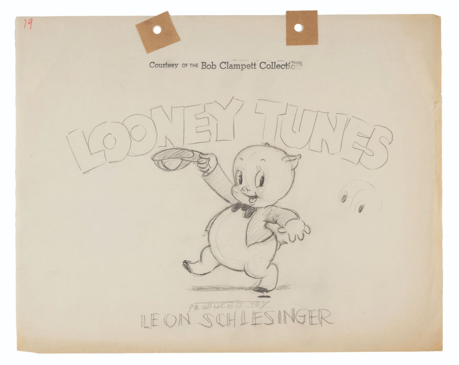 (Schlesinger, 1939) The original layout drawing for the title card seen on the sixteen Looney Tunes cartoons from “Porky’s Hotel” in 1939 through “Patient Porky” in 1940. The design reflects the changes Bob Clampett had begun to make to Porky in an effort to make him more appealing to the audience. Accomplished in graphite and measuring 9.5” x 12” with a character image size of 4” x 4.25”, the drawing displays in good condition stamped “Courtesy of the Bob Clampett Collection,” with light edge wear and creasing from production use and light discoloration from age.