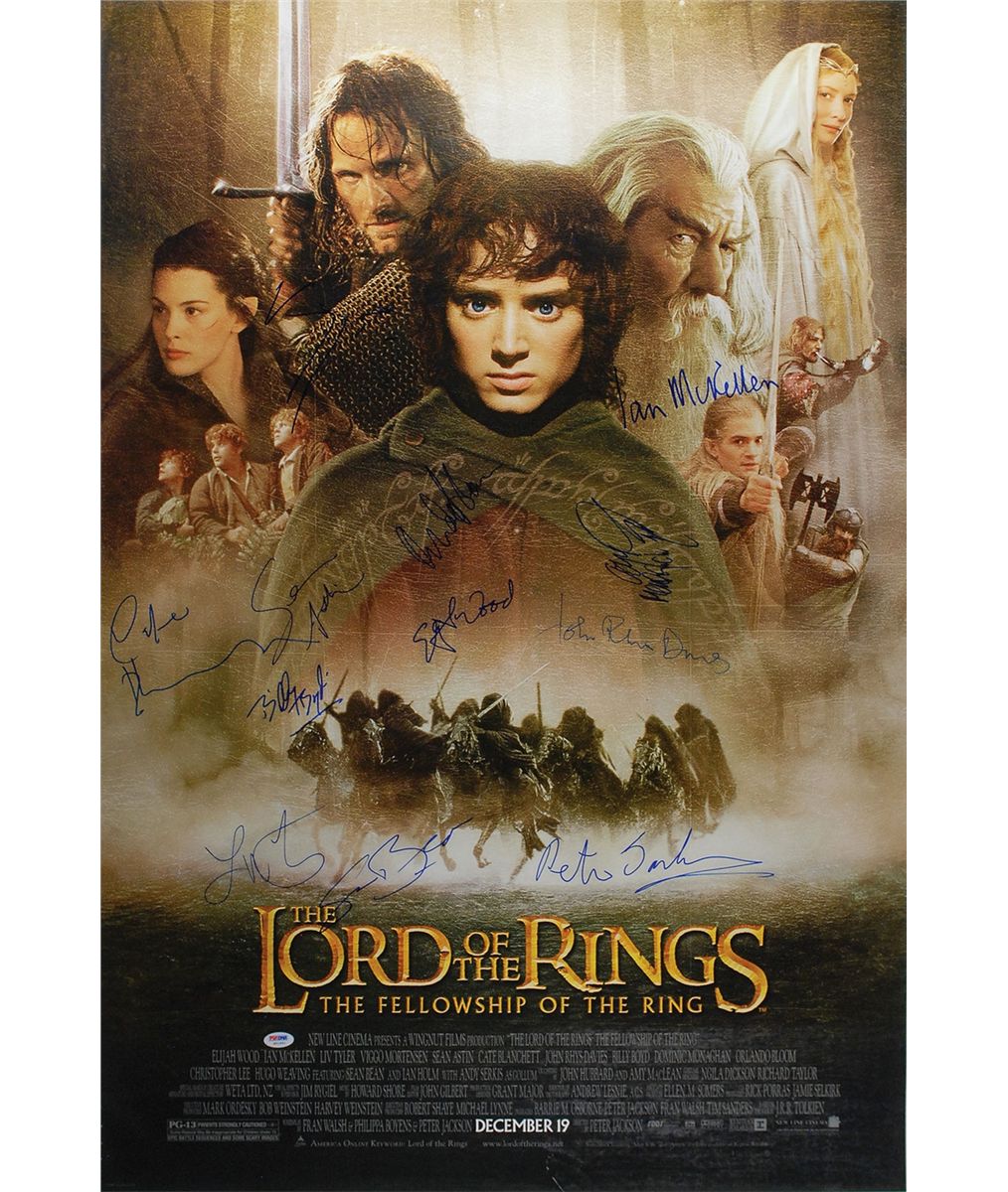 Color 27 x 40 one-sheet movie poster for The Fellowship of the Ring, signed in blue felt tip by cast and crew members: Viggo Mortensen, Sean Astin, Cate Blanchett, Orlando Bloom, Elijah Wood, Billy Boyd, John Rhys-Davies, Ian McKellen, Dominic Monaghan, Liv Tyler, Sean Bean, and Peter Jackson. In fine condition, with a PSA/DNA authentication label affixed near the bottom. Accompanied by a full letter of authenticity and grading from PSA/DNA, grading the autographs a “9.”