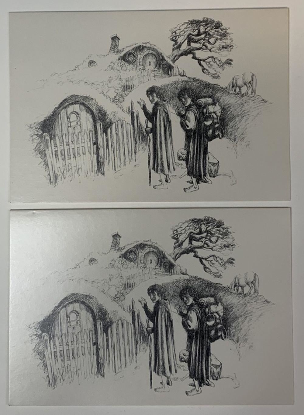 Set of two crew gift cards given to the cast and crew on the Peter Jackson directed production of The Lord of the Rings trilogy (2001-2003), the epic fantasy adventure movies where, Gandalf and Aragorn lead the World of Men against Sauron's army to draw his gaze from Frodo and Sam as they approach Mount Doom with the One Ring.