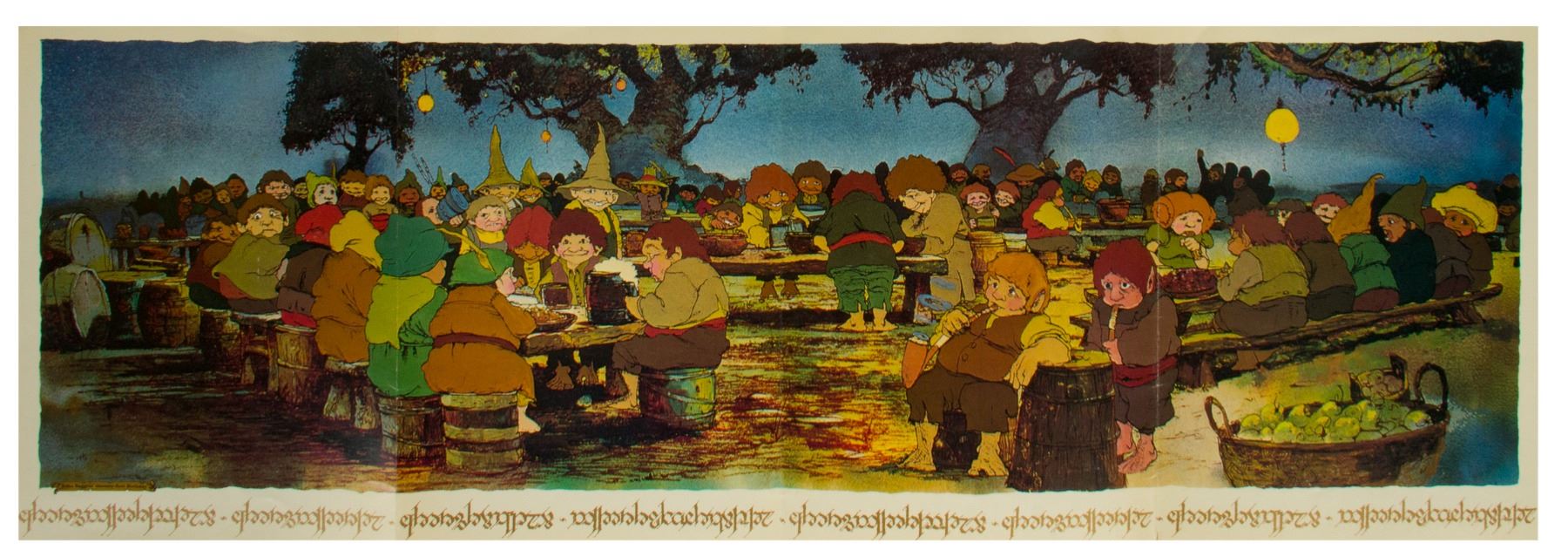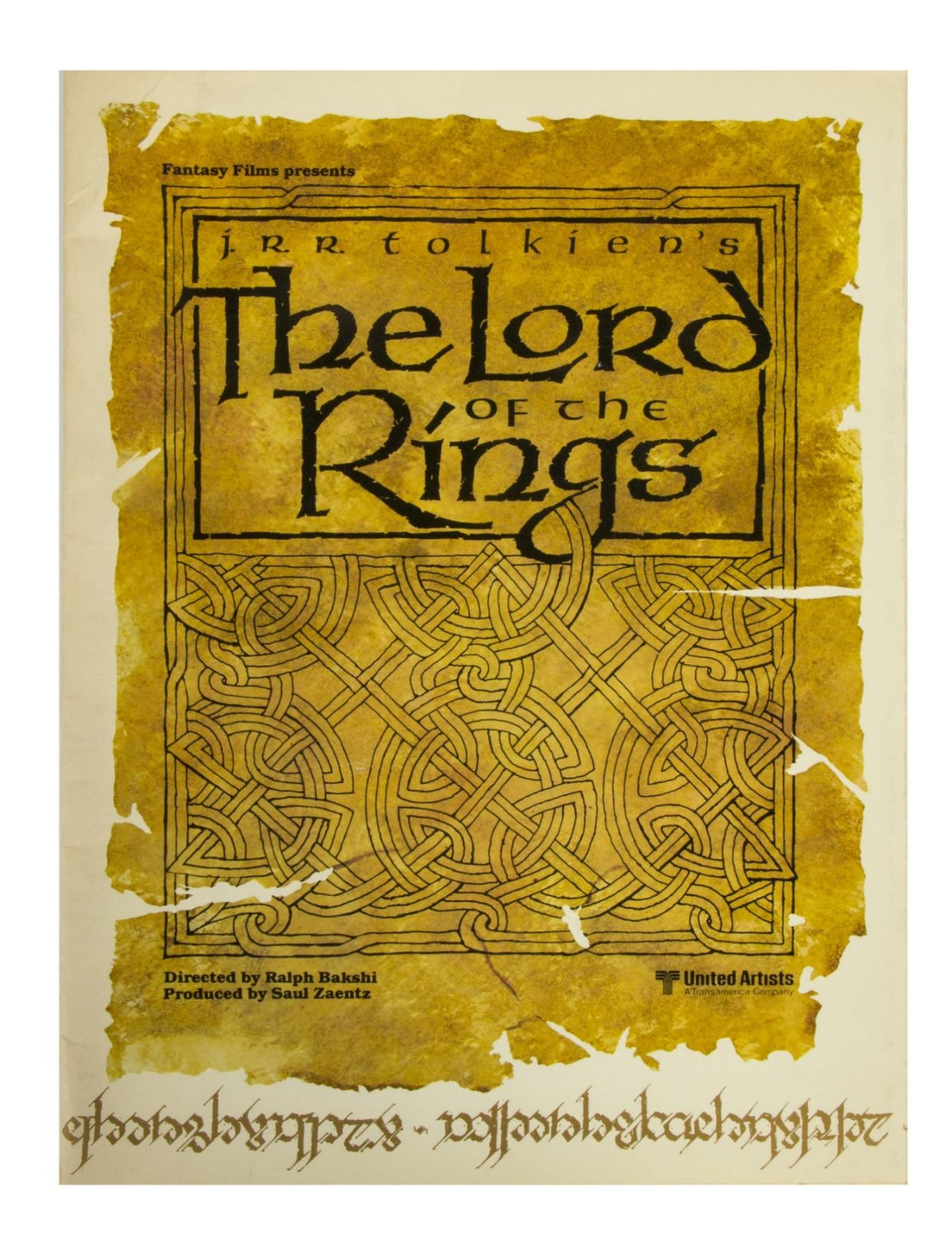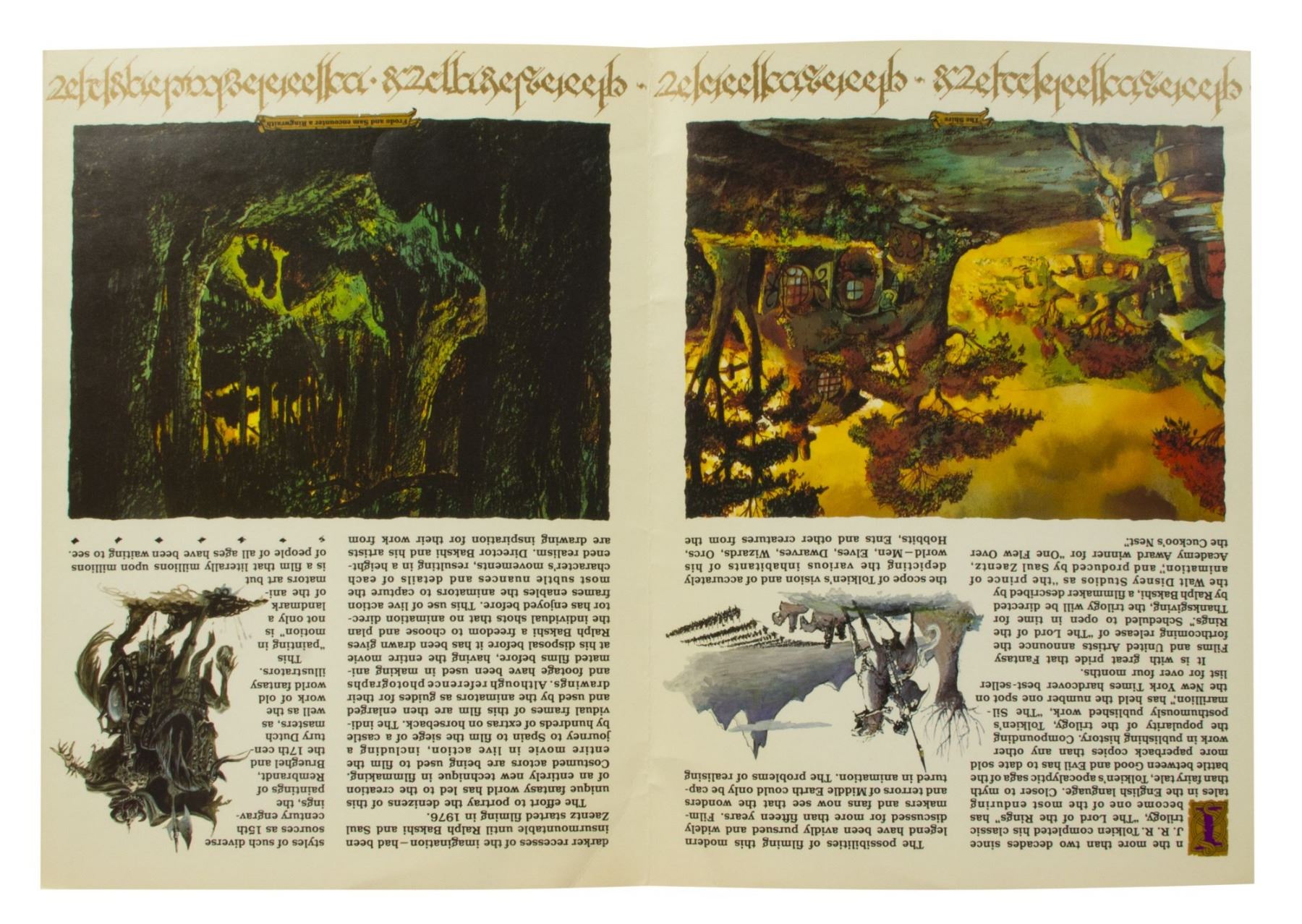 (Bakshi, 1978) A publicity packet for Ralph Bakshi's animated feature film "The Lord of the Rings". The packet contains some information on the film and beautiful illustrations throughout including a "Fellowship of the Ring" group image on the back, and unfolds to a large poster image. The packet measures 11.75"x8.75" folded, and 11.75"x35" unfolded to reveal the poster inside. The condition is good with some creases and edge-wear from use.