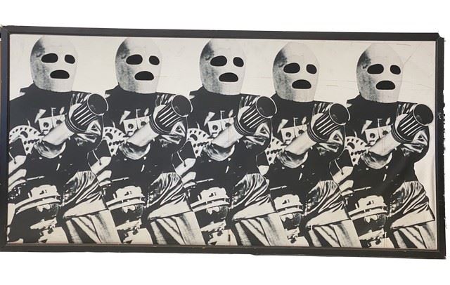 Direct from the horror film, "The Lords of Salem", written and directed by acclaimed director, Rob Zombie, comes this screen used hero, hand painted, and special effect enabled revolutionists seen in the trailer and pivotal scenes in the film (measures 8' x 4'). Interesting fact: The artwork was designed by Rob Zombie and the prop master rigged the back to make it bleed in the film.