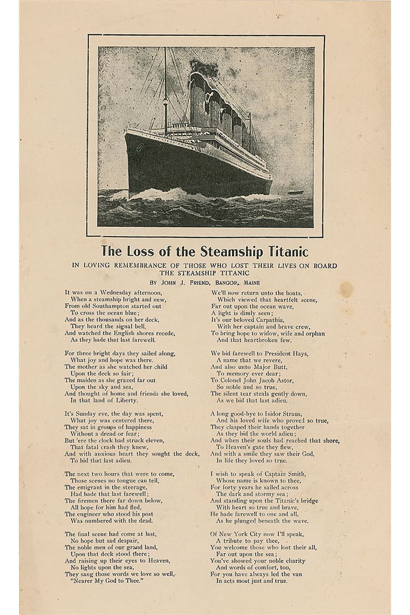 Ten-stanza poem by John J. Friend of Bangor, Maine, entitled ‘The Loss of the Steamship Titanic: In Loving Remembrance of Those Who Lost Their Lives on Board the Steamship Titanic,’ 8.75 x 13.75, featuring an artist’s depiction of the liner at the top. In very good condition, with three noticeable diagonal creases, other light scattered creases and soiling, and mild overall toning.